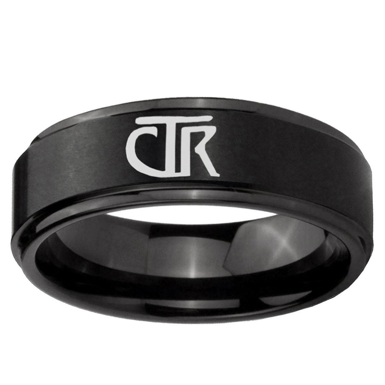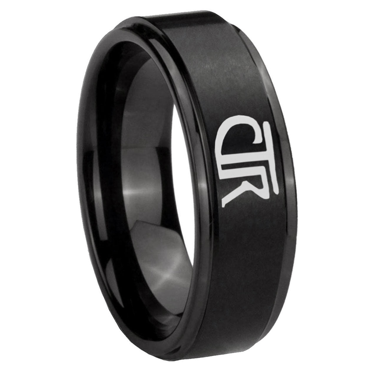Intruding 5, 8mm CTR Step Edges Brush Black Tungsten Carbide Mens Wedding Band . Offer in both 5mm and 8mm band width brush black plated finished from size 4 to 14