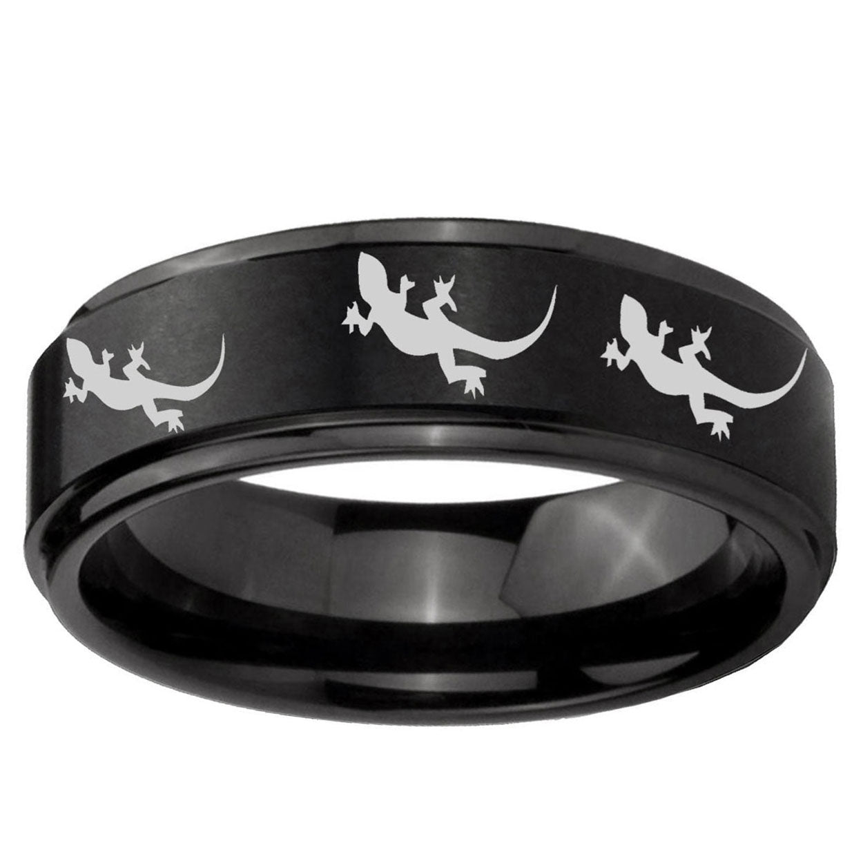 Intruding 5, 8mm Multiple Lizard Step Edges Brush Black Tungsten Carbide Wedding Band Mens . Offer in both 5mm and 8mm band width brush black plated finished from size 4 to 14
