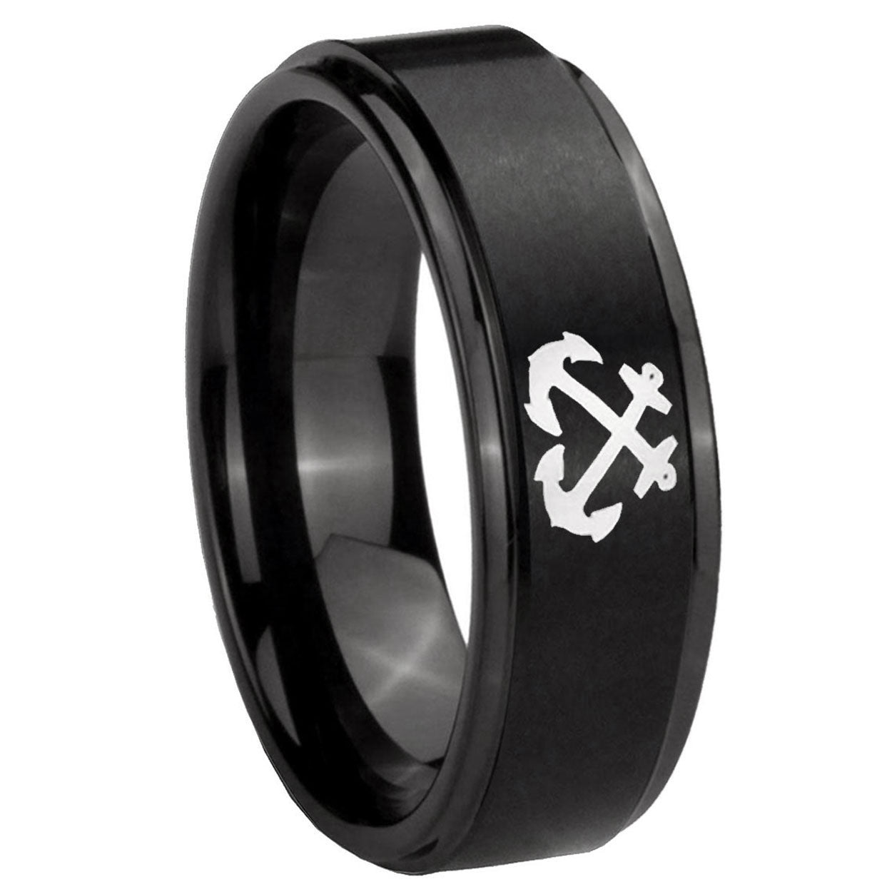 Intruding 5, 8mm Anchor Step Edges Brush Black Tungsten Carbide Wedding Band Ring . Offer in both 5mm and 8mm band width brush black plated finished from size 4 to 14