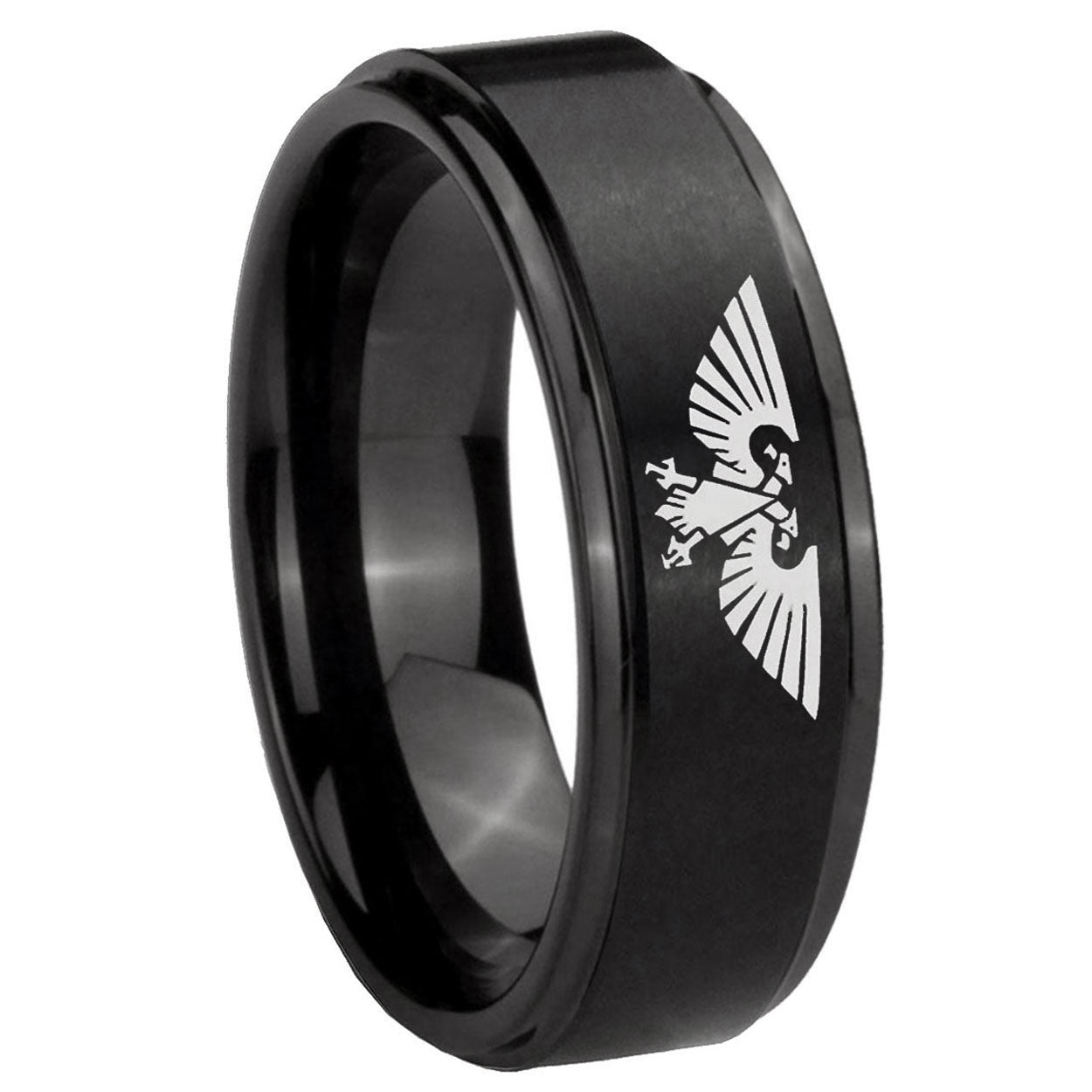 Intruding 5, 8mm Aquila Step Edges Brush Black Tungsten Carbide Men's Promise Rings . Offer in both 5mm and 8mm band width brush black plated finished from size 4 to 14