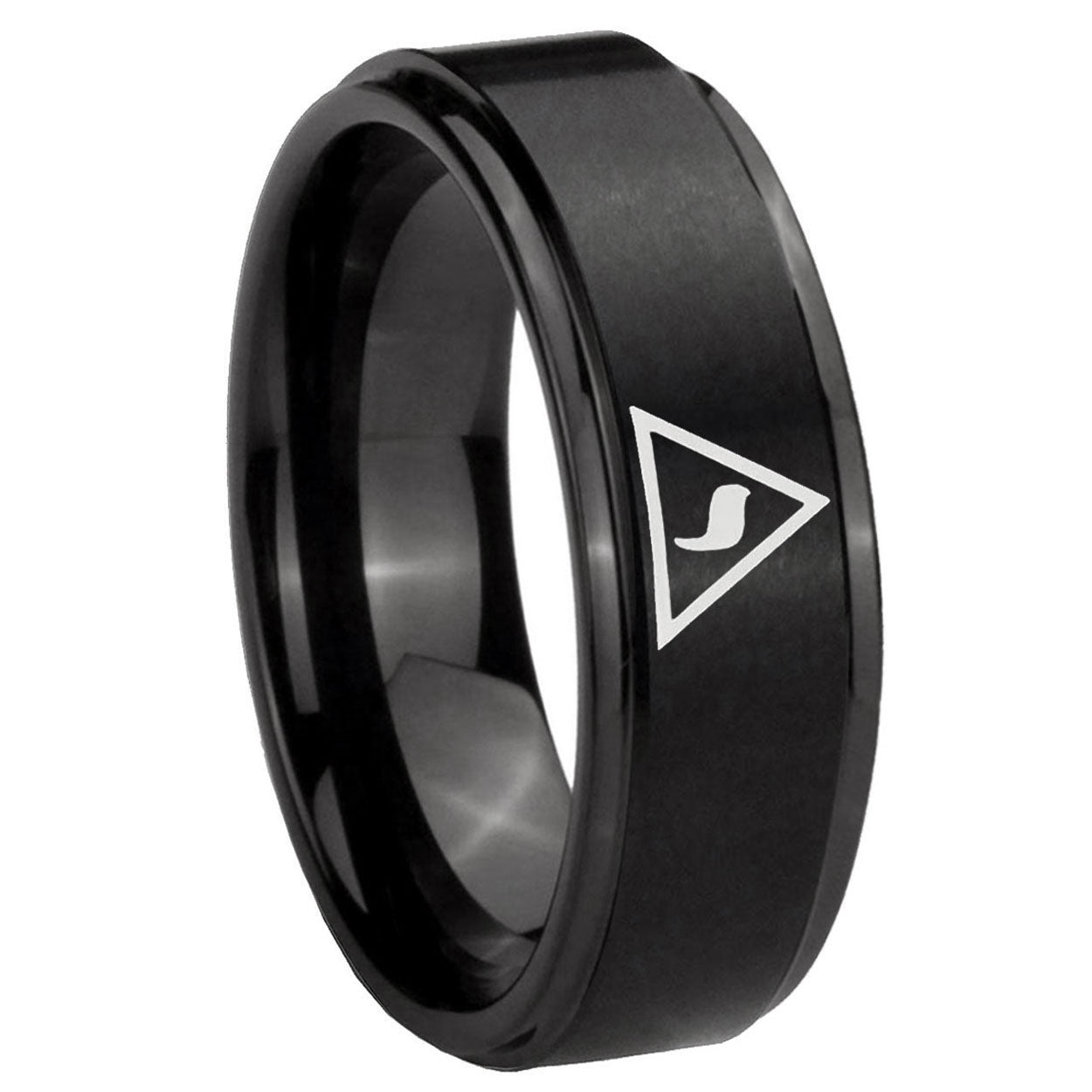 Intruding 5, 8mm Masonic Yod Step Edges Brush Black Tungsten Carbide Mens Engagement Band . Offer in both 5mm and 8mm band width brush black plated finished from size 4 to 14