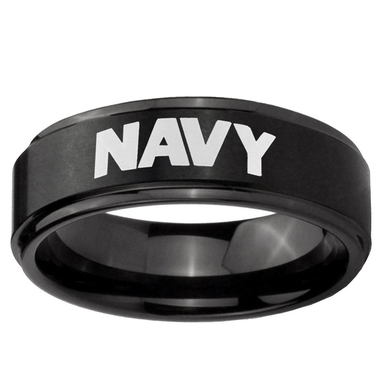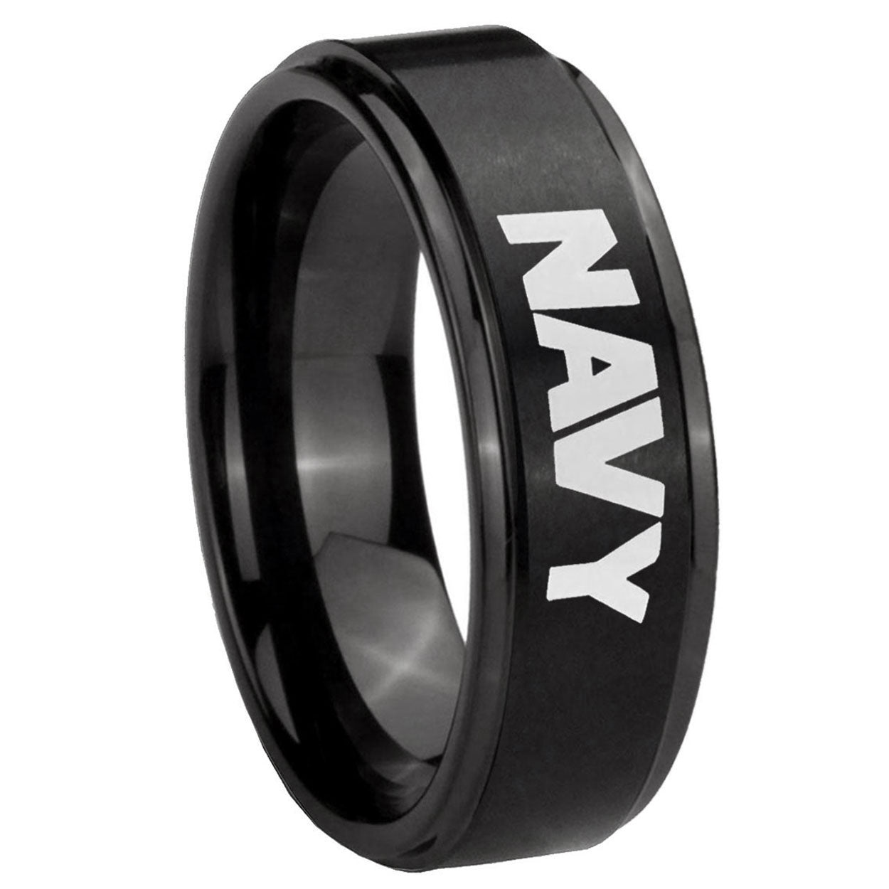 Intruding 5, 8mm Navy Step Edges Brush Black Tungsten Carbide Men's Wedding Band . Offer in both 5mm and 8mm band width brush black plated finished from size 4 to 14