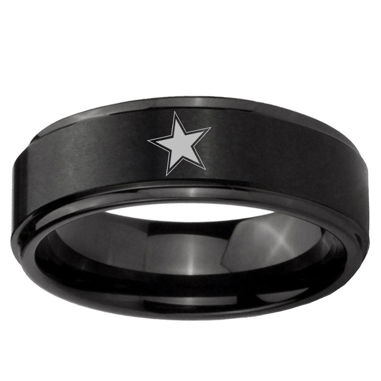 Intruding 5, 8mm Cowboys Star Step Edges Brush Black Tungsten Carbide Bands Ring . Offer in both 5mm and 8mm band width brush black plated finished from size 4 to 14