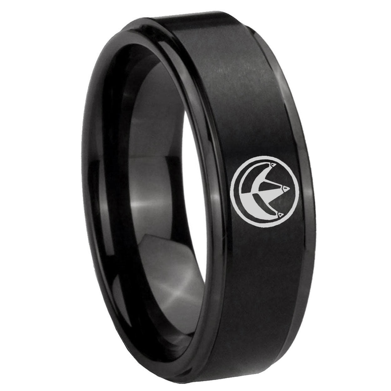 Intruding 5, 8mm Green Ranger Power Step Edges Brush Black Tungsten Carbide Bands Ring . Offer in both 5mm and 8mm band width brush black plated finished from size 4 to 14