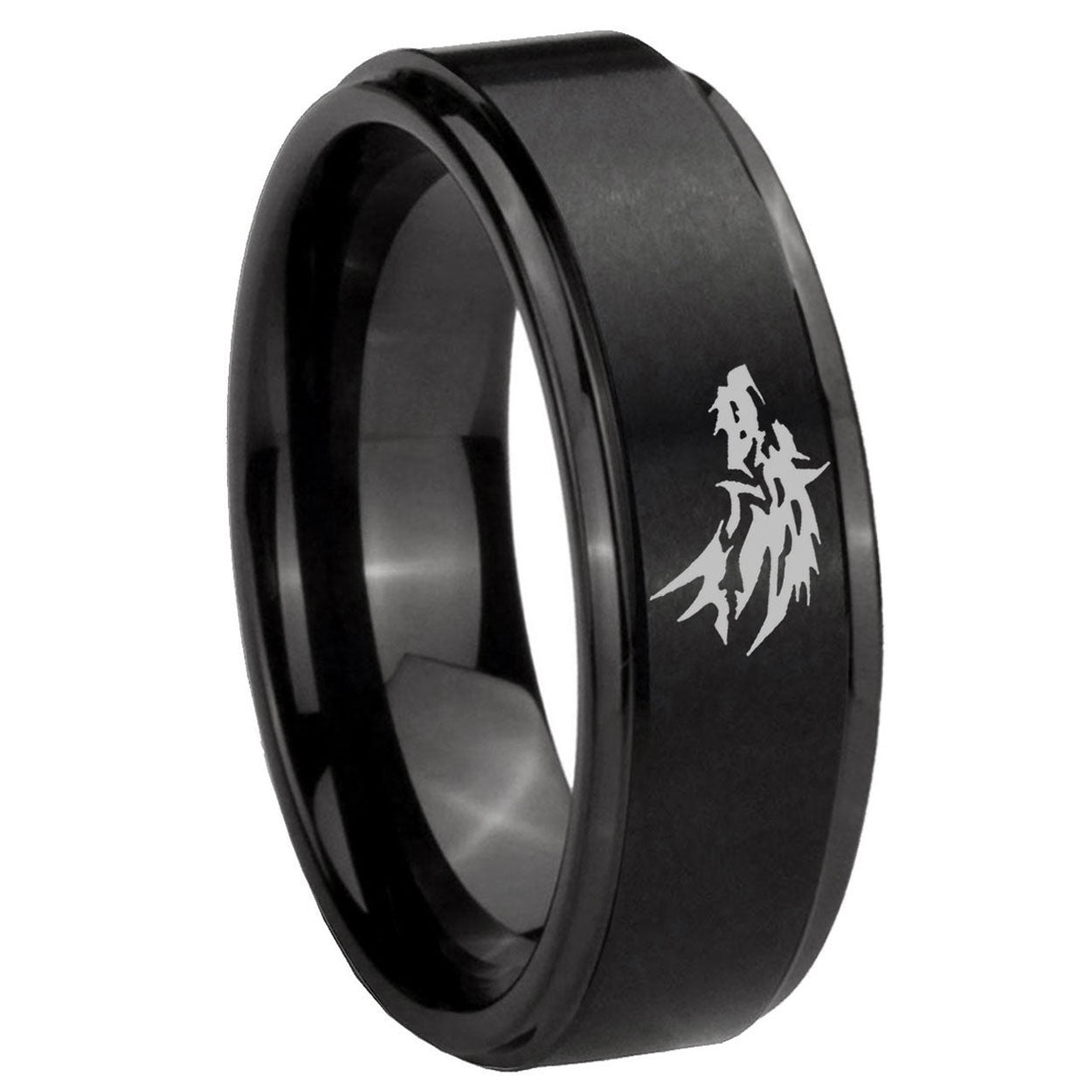 Intruding 5, 8mm Wolf Step Edges Brush Black Tungsten Carbide Wedding Band Ring . Offer in both 5mm and 8mm band width brush black plated finished from size 4 to 14