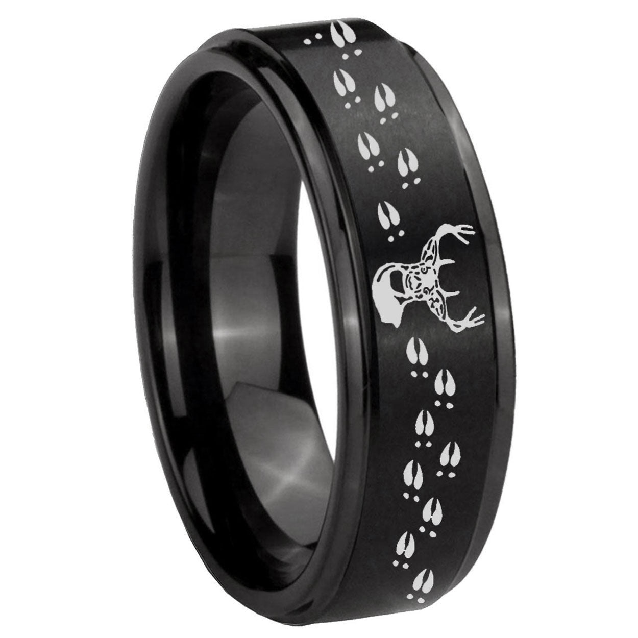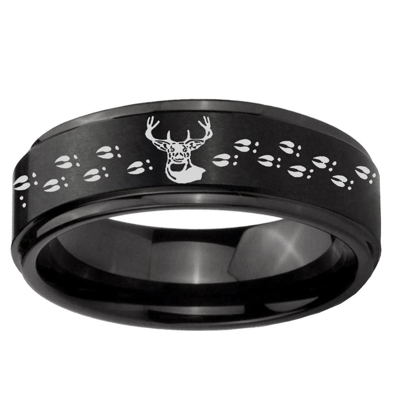 Intruding 5, 8mm Deer Antler Step Edges Brush Black Tungsten Carbide Men's Band Ring . Offer in both 5mm and 8mm band width brush black plated finished from size 4 to 14