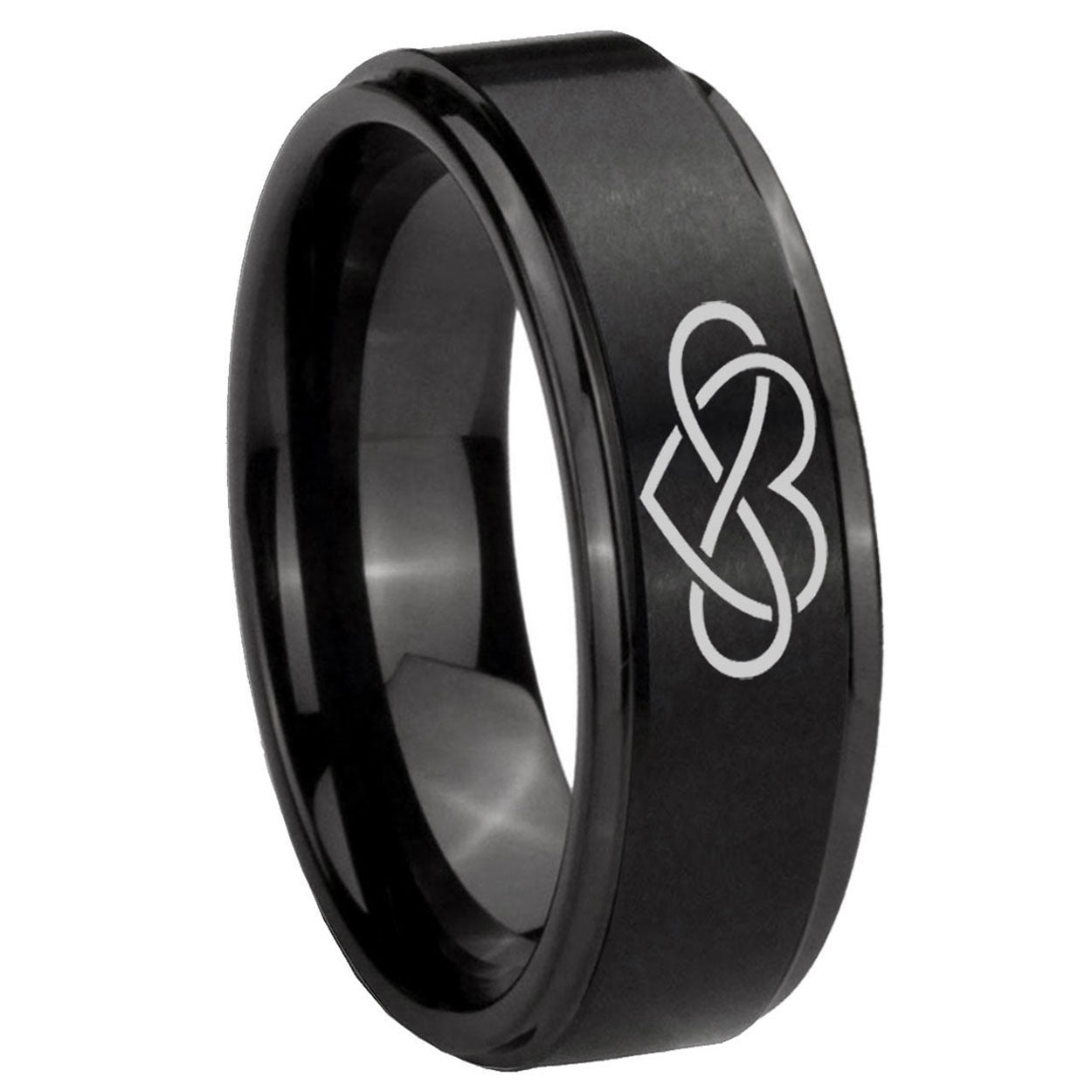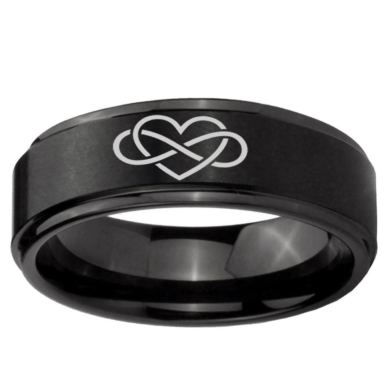 Intruding 5, 8mm Infinity Love Step Edges Brush Black Tungsten Carbide Anniversary Ring . Offer in both 5mm and 8mm band width brush black plated finished from size 4 to 14