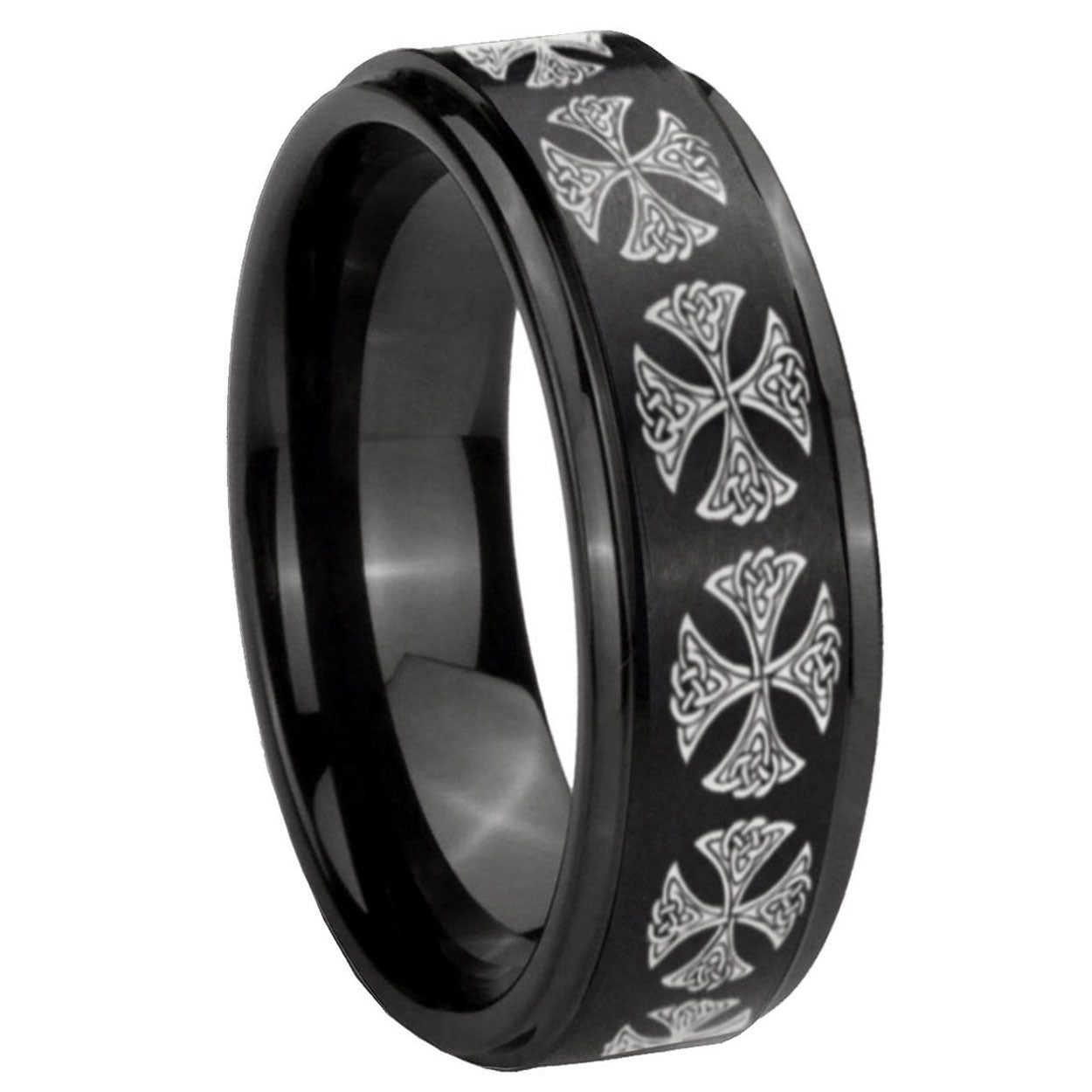 Intruding 5, 8mm Medieval Cross Step Edges Brush Black Tungsten Carbide Men's Band Ring . Offer in both 5mm and 8mm band width brush black plated finished from size 4 to 14
