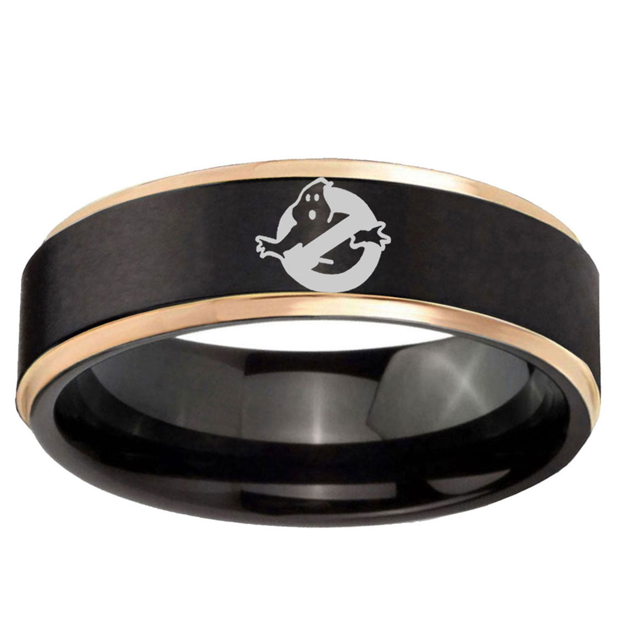 Intruding 6, 8mm Ghostbusters Rose Gold Step Edge Black Tungsten Carbide Wedding Band Mens . Offer in both 6mm and 8mm band width black plated finished from size 6 to 14