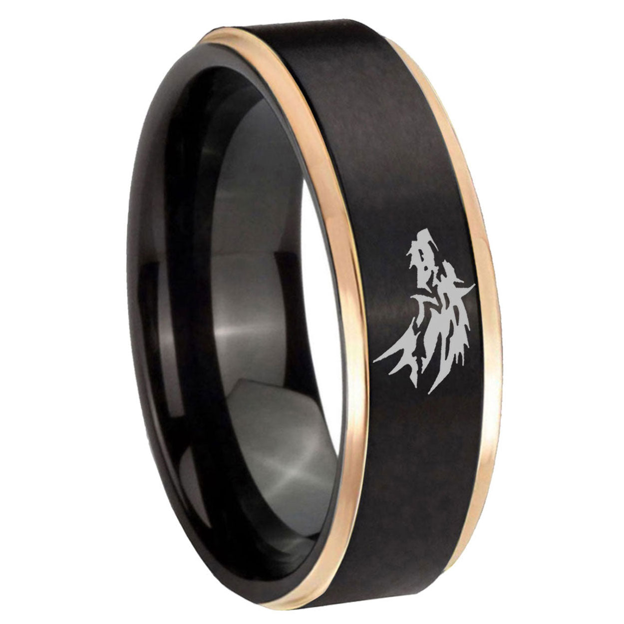 Intruding 6, 8mm Wolf Rose Gold Step Edge Black Tungsten Men's Ring . Offer in both 6mm and 8mm band width rose gold and black plated finished from size 6 to 14