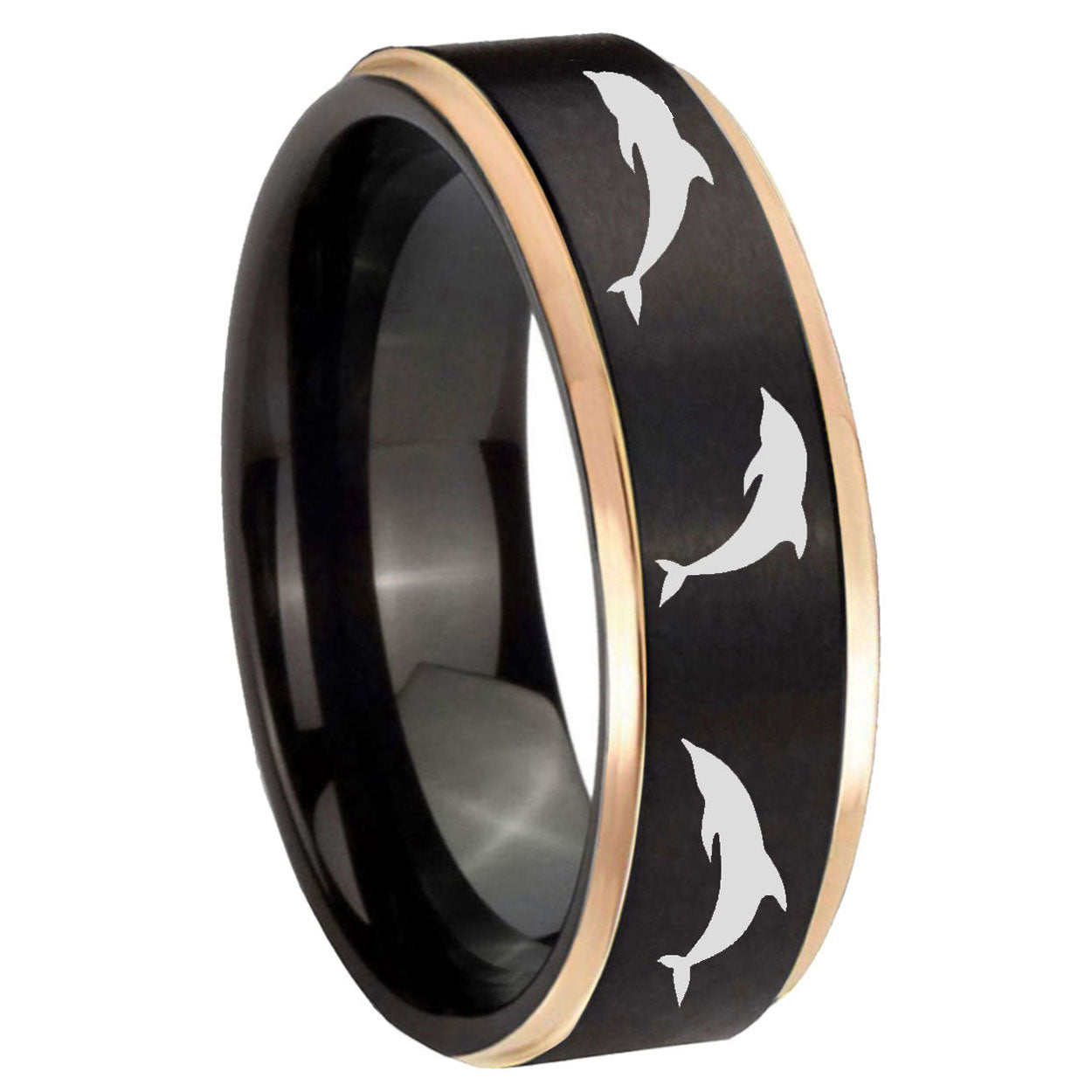 6, 8mm Dolphins Rose Gold Step Edge Black Tungsten Carbide Personalized Ring