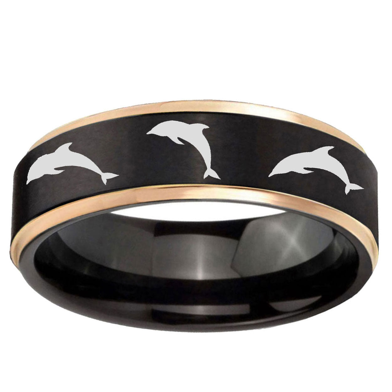 Intruding 6, 8mm Dolphins Rose Gold Step Edge Black Tungsten Carbide Personalized Ring . Offer in both 6mm and 8mm band width black plated finished from size 6 to 14