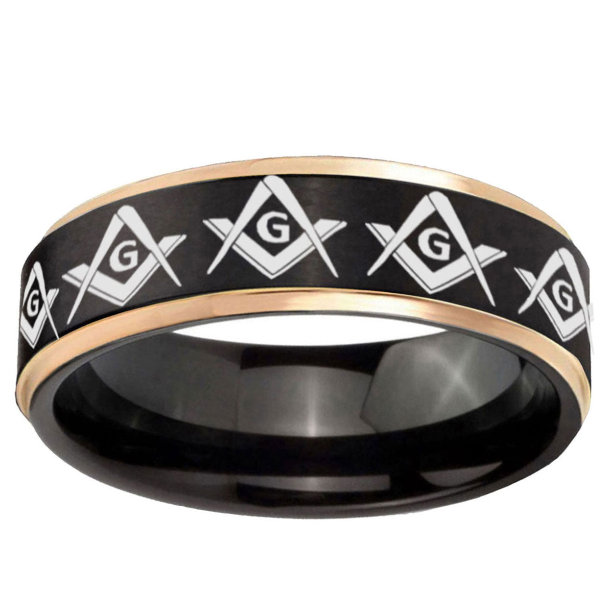 Intruding 6, 8mm Masonic Square and Compass Rose Gold Step Edge Black Tungsten Carbide Men's Wedding Ring . Offer in both 6mm and 8mm band width rose gold and black plated finished from size 6 to 14
