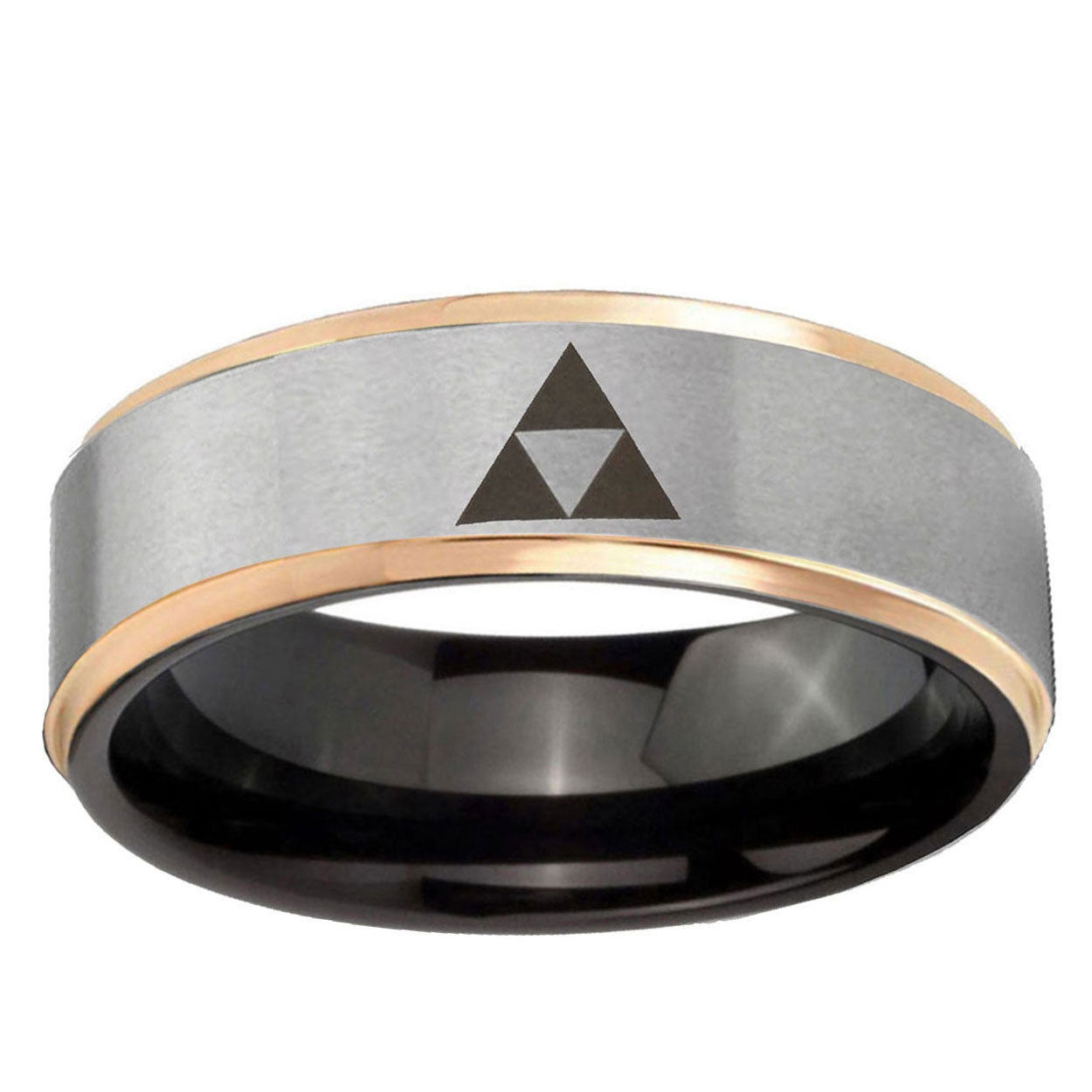 Intruding 8mm Zelda Triforce Rose Gold Step Edge Gray Tungsten Carbide Custom Mens Ring . Offer in men wedding band in 8mm band width black plated finished from size 7 to 14