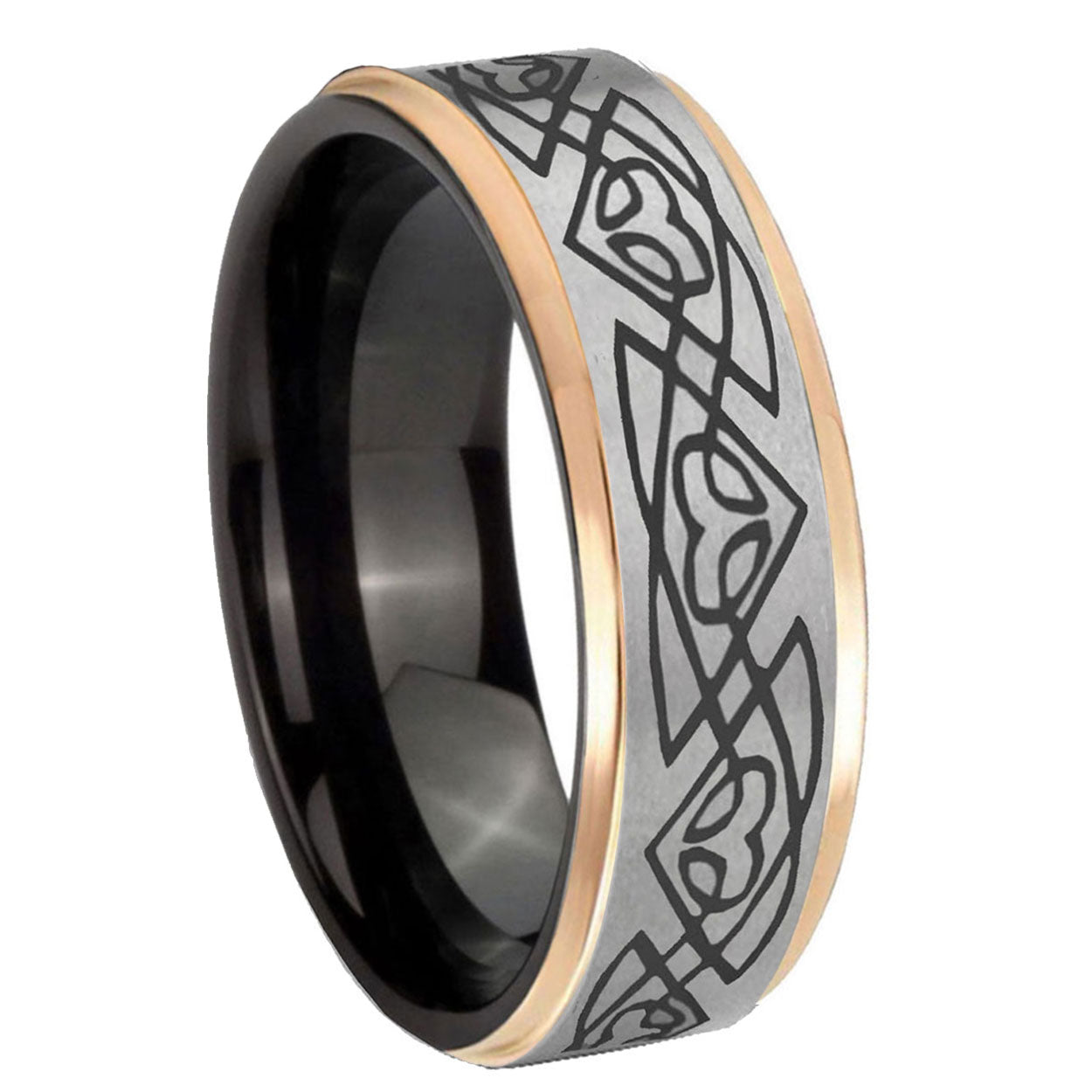 Intruding 8mm Celtic Braided Rose Gold Step Edge Gray Tungsten Carbide Men's Wedding Ring . Offer in men wedding band in 8mm band width rose gold and gray plated finished from size 7 to 14
