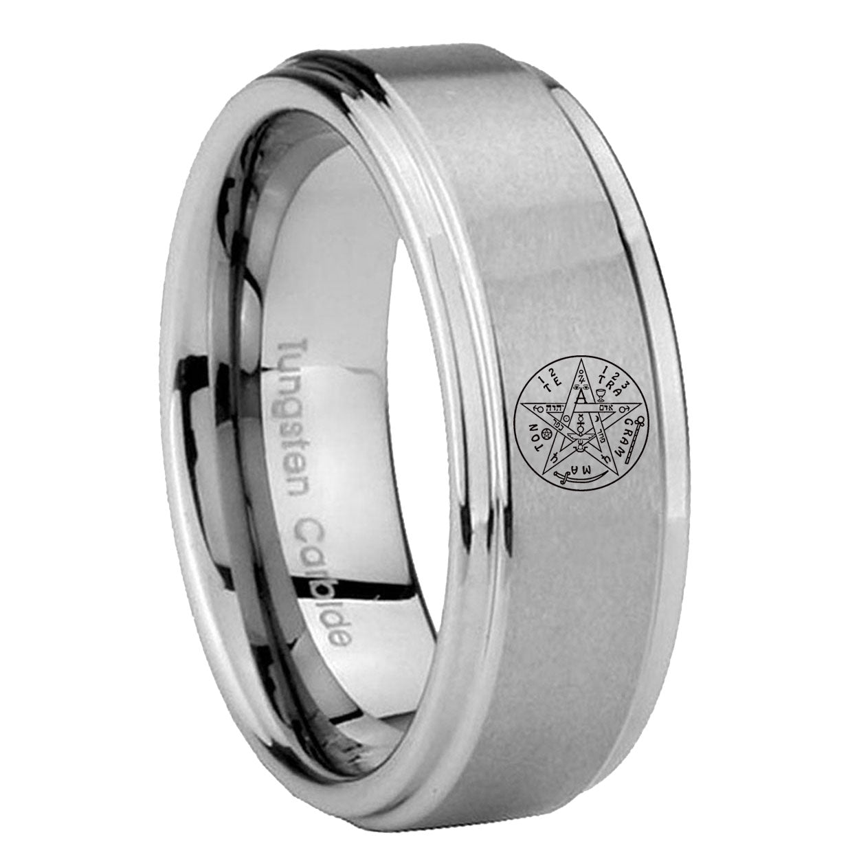 Intruding 5, 8mm Tetragrammaton Spiritual Kabbalah Step Edge Brushed Silver Men's Wedding Rings Engraved . Offer in both 5mm and 8mm band width brushed grey finished from size 4 to 14