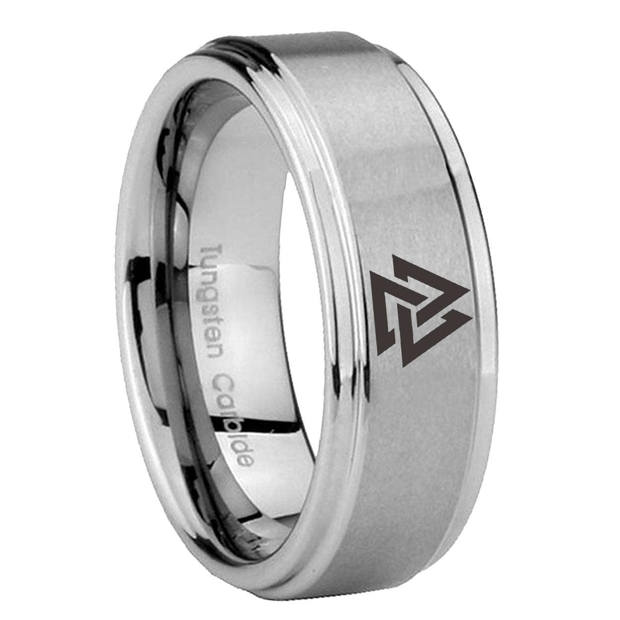 Intruding 5, 8mm Viking Symbol Step Edge Brushed Silver Men's Wedding Rings Engraved . Offer in both 5mm and 8mm band width brushed grey finished from size 4 to 14