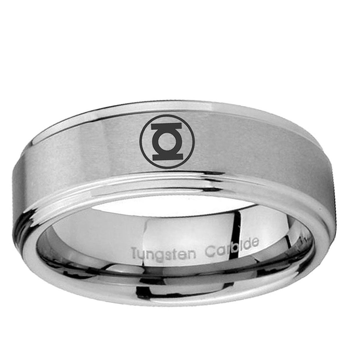 Intruding 5, 8mm Green Lantern Step Edge Brushed Silver Men's Wedding Rings Engraved . Offer in both 5mm and 8mm band width brushed grey finished from size 4 to 14