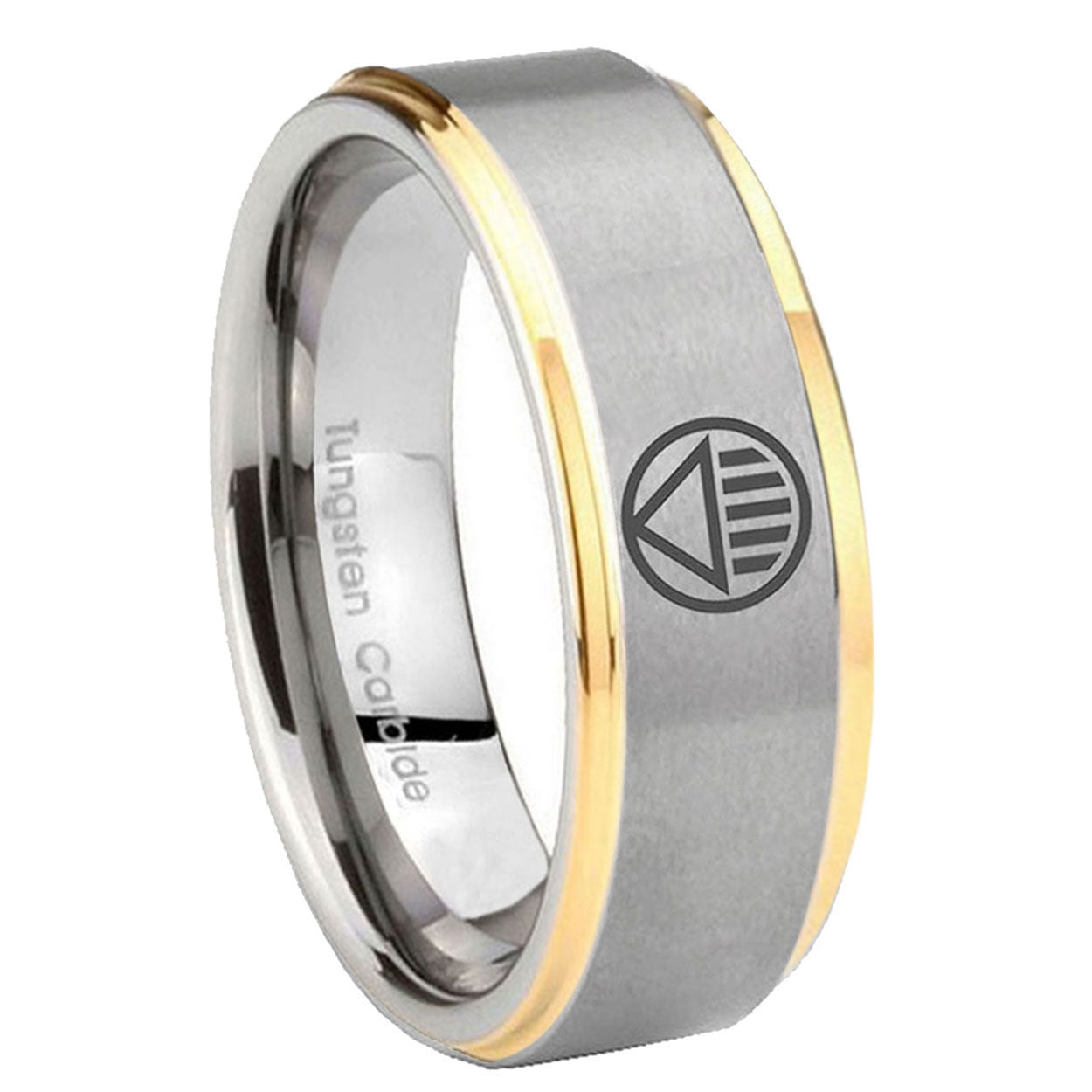 Intruding 5, 8mm Black Lantern Step Edge Gold and Gray Mens Tungsten Ring . Offer in both 5mm and 8mm band width brushed grey and gold finished from size 4 to 14
