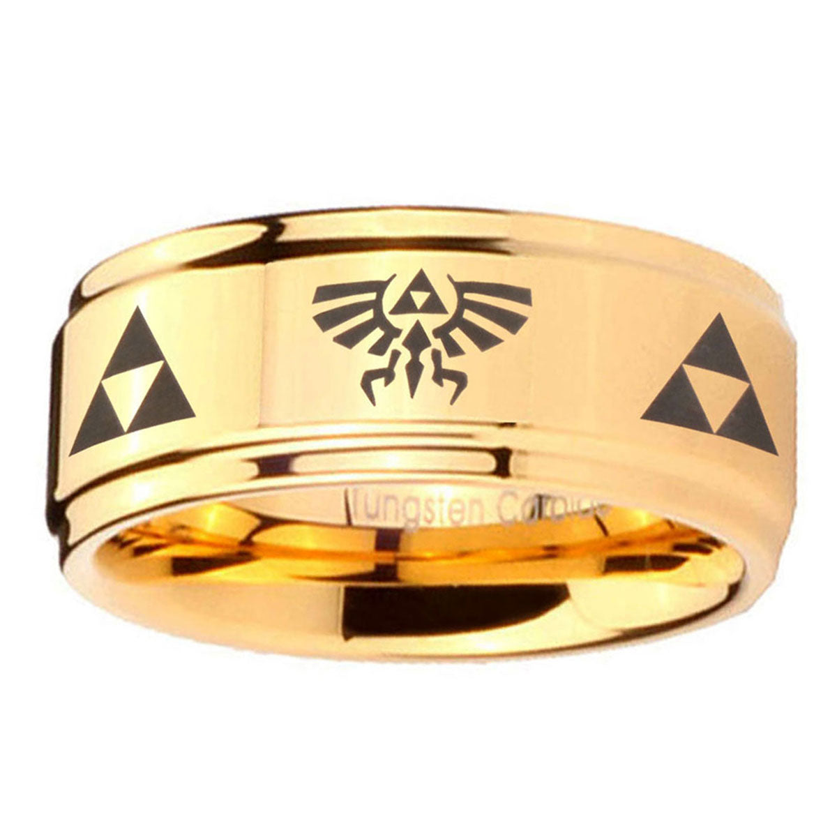 Introuding 5, 8mm Triforce Legend of Zelda Step Edge Gold Tungsten Engagement Rings For Him . Offer in both 5mm and 8mm band width 18k gold plated finished from size 4 to 14