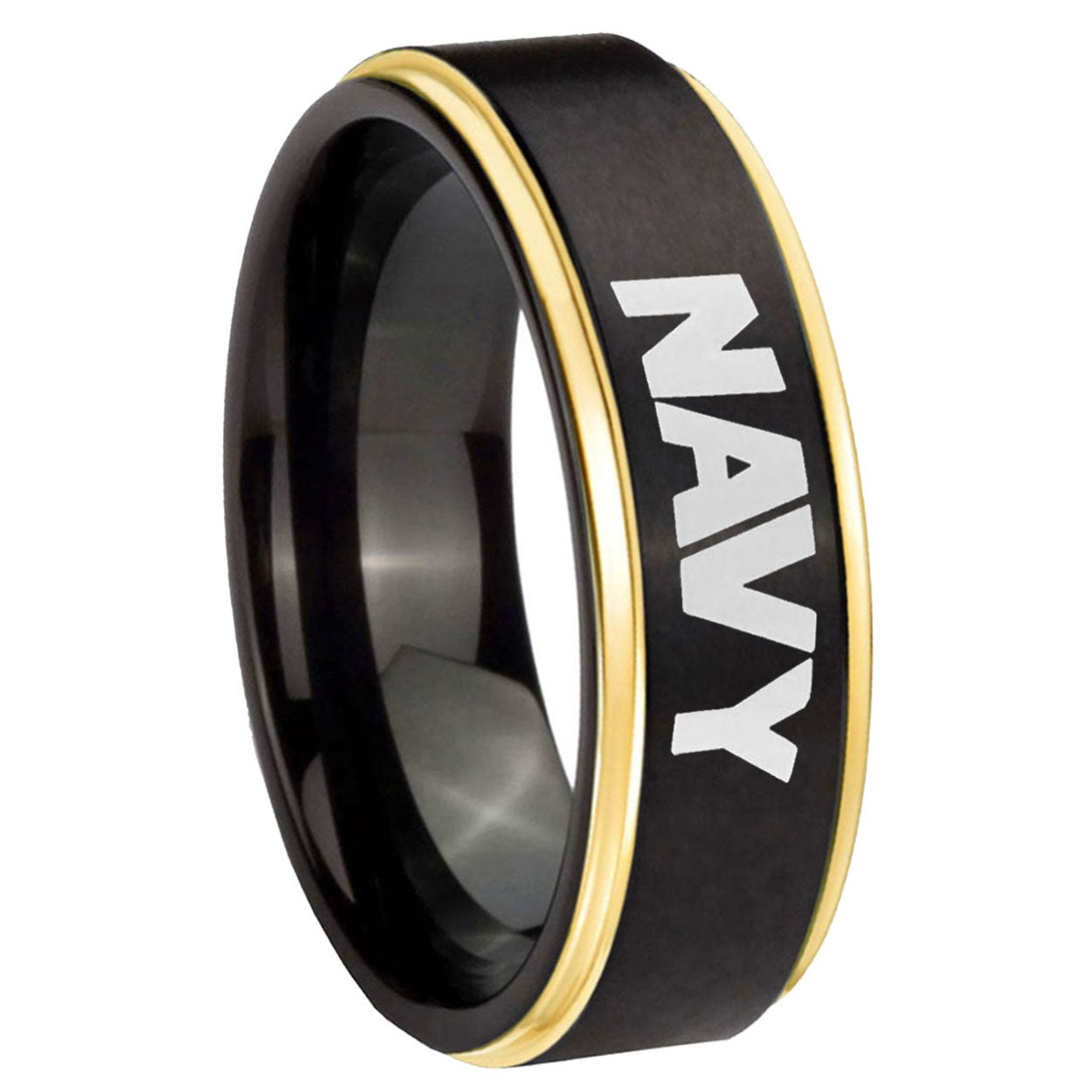 Intruding 6, 8mm Navy Gold Step Edge Black Tungsten Carbide Men's Wedding Band . Offer in both 6mm and 8mm band width black plated finished from size 5 to 14