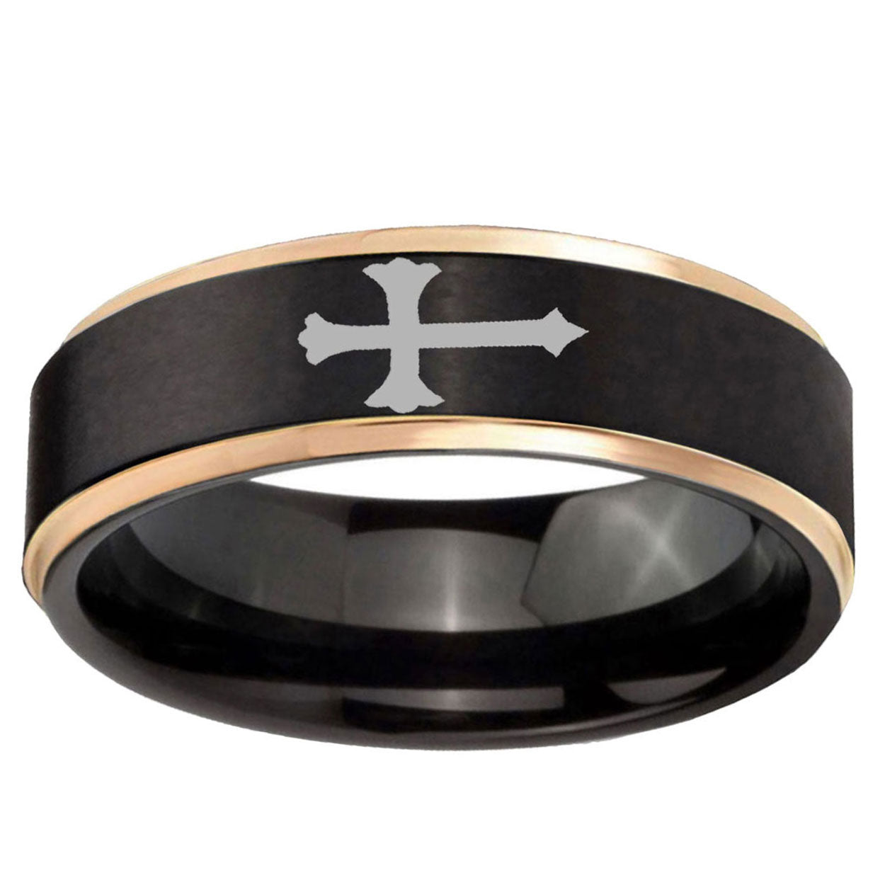 Intruding 6, 8mm Christian Cross Rose Gold Step Edge Black Tungsten Mens Engagement Band . Offer in both 6mm and 8mm band width black plated finished from size 6 to 14
