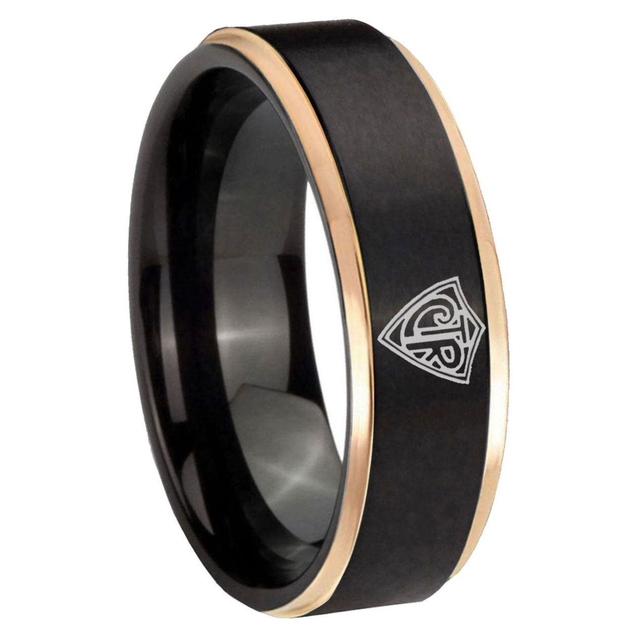 Intruding 6, 8mm CTR Rose Gold Step Edge Black Tungsten Carbide Mens Promise Ring . Offer in both 6mm and 8mm band width black plated finished from size 6 to 14