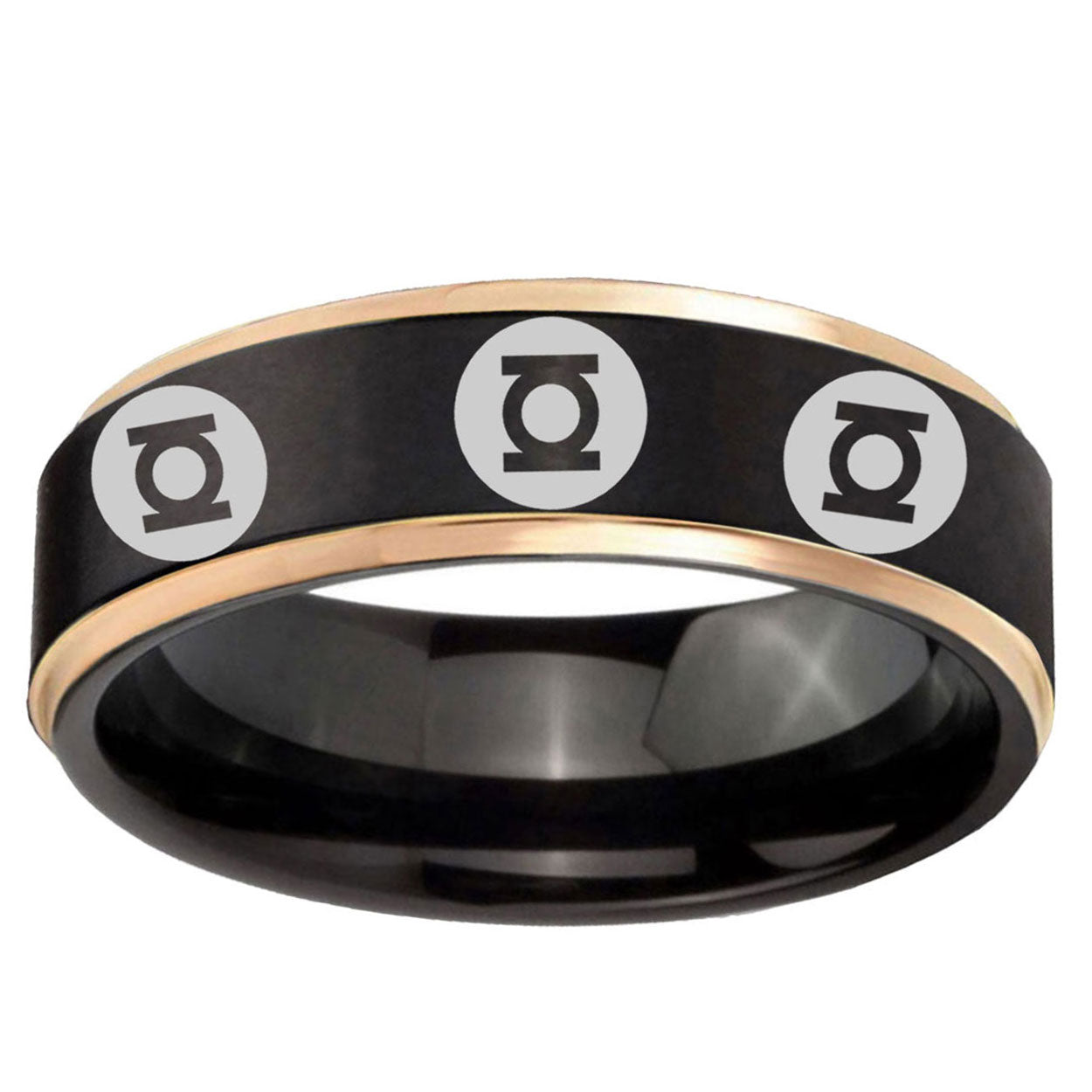 Intruding 6, 8mm Multiple Green Lantern Rose Gold Step EdgeUnique Men Wedding Ring . Offer in both 6mm and 8mm band width brushed black plated finished from size 6 to 14