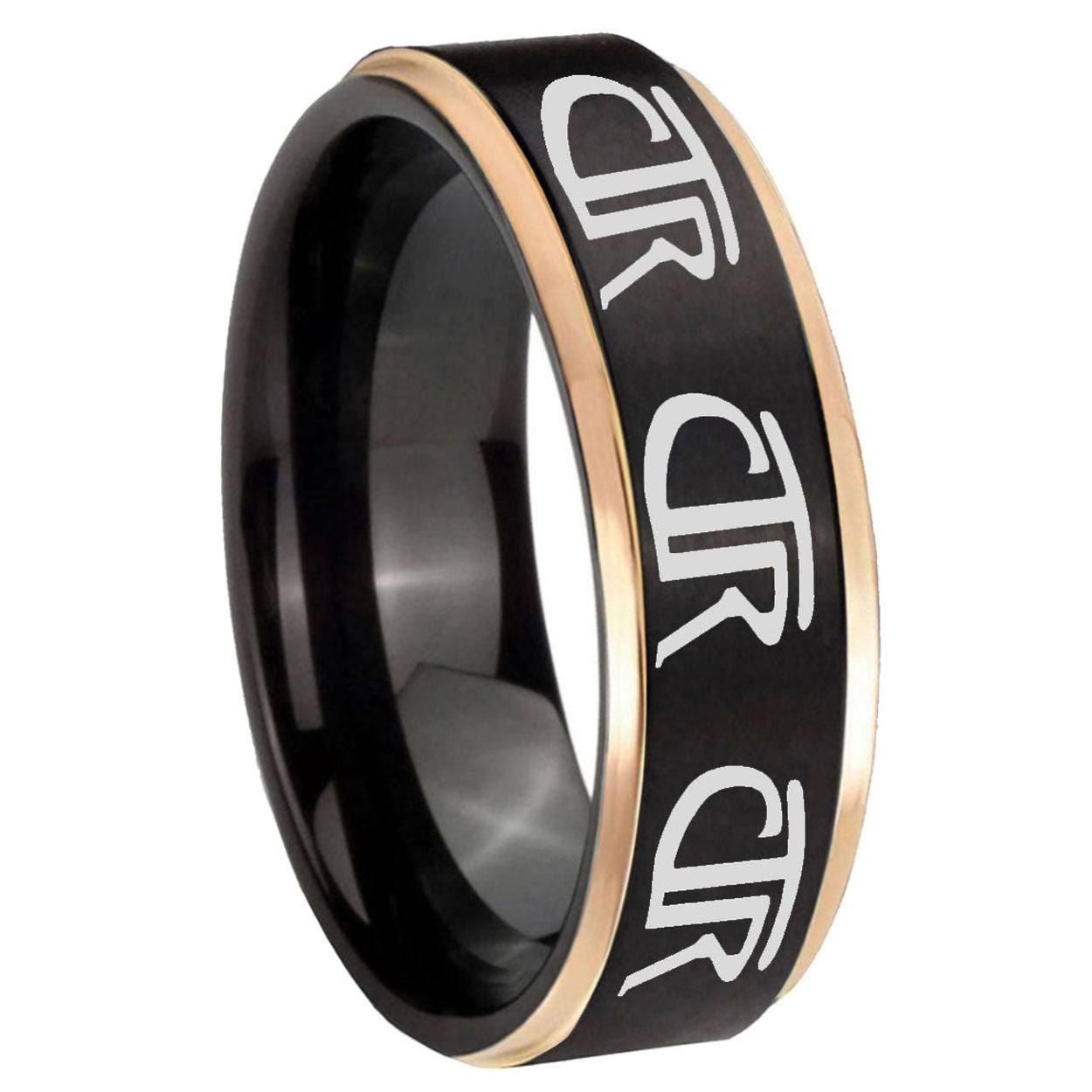 Intruding 6, 8mm Multiple CTR Rose Gold Step Edge Black Tungsten Carbide Mens Promise Ring . Offer in both 6mm and 8mm band width black plated finished from size 6 to 14