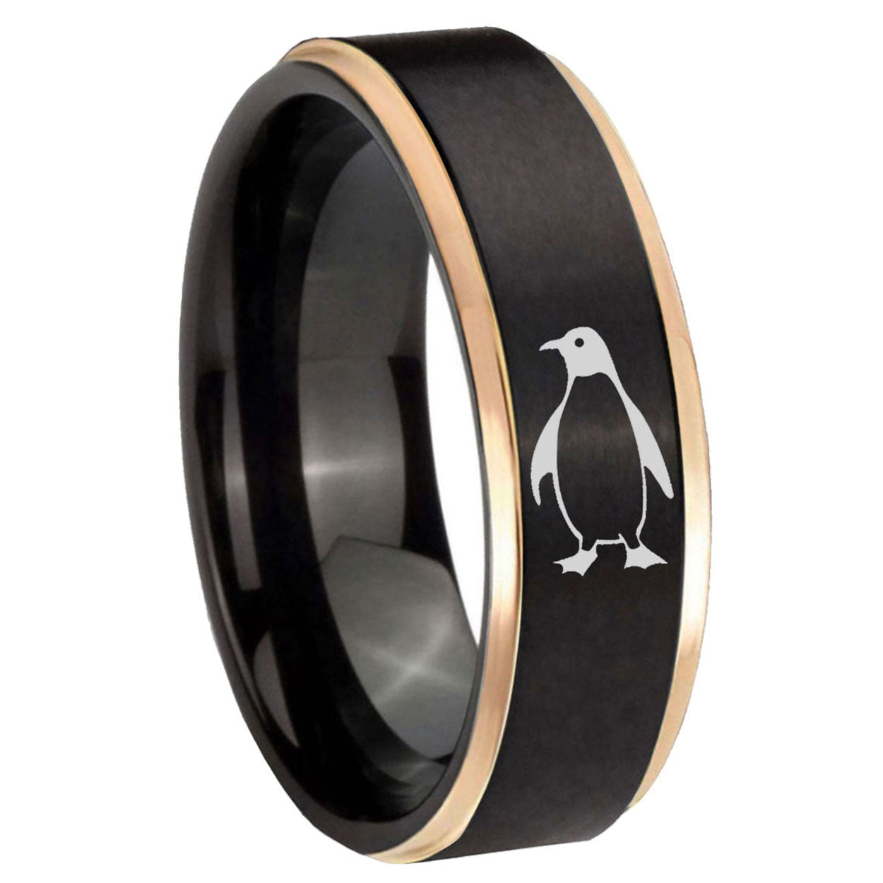 Intruding 6, 8mm Penguin Rose Gold Step Edge Black Tungsten Carbide Men's Wedding Ring . Offer in both 6mm and 8mm band width rose gold and black plated finished from size 6 to 14