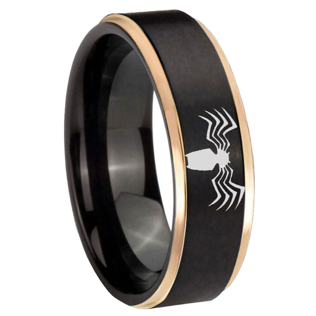 Intruding 6, 8mm Spider Rose Gold Step Edge Black Tungsten Carbide Promise Ring . Offer in both 6mm and 8mm band width black plated finished from size 6 to 14