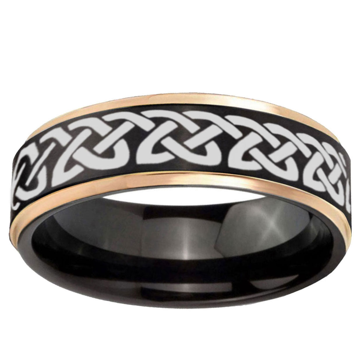 Intruding 6, 8mm Celtic Knot Love Rose Gold Step Edge Black Tungsten Carbide Men's Wedding Ring . Offer in both 6mm and 8mm band width rose gold and black plated finished from size 6 to 14