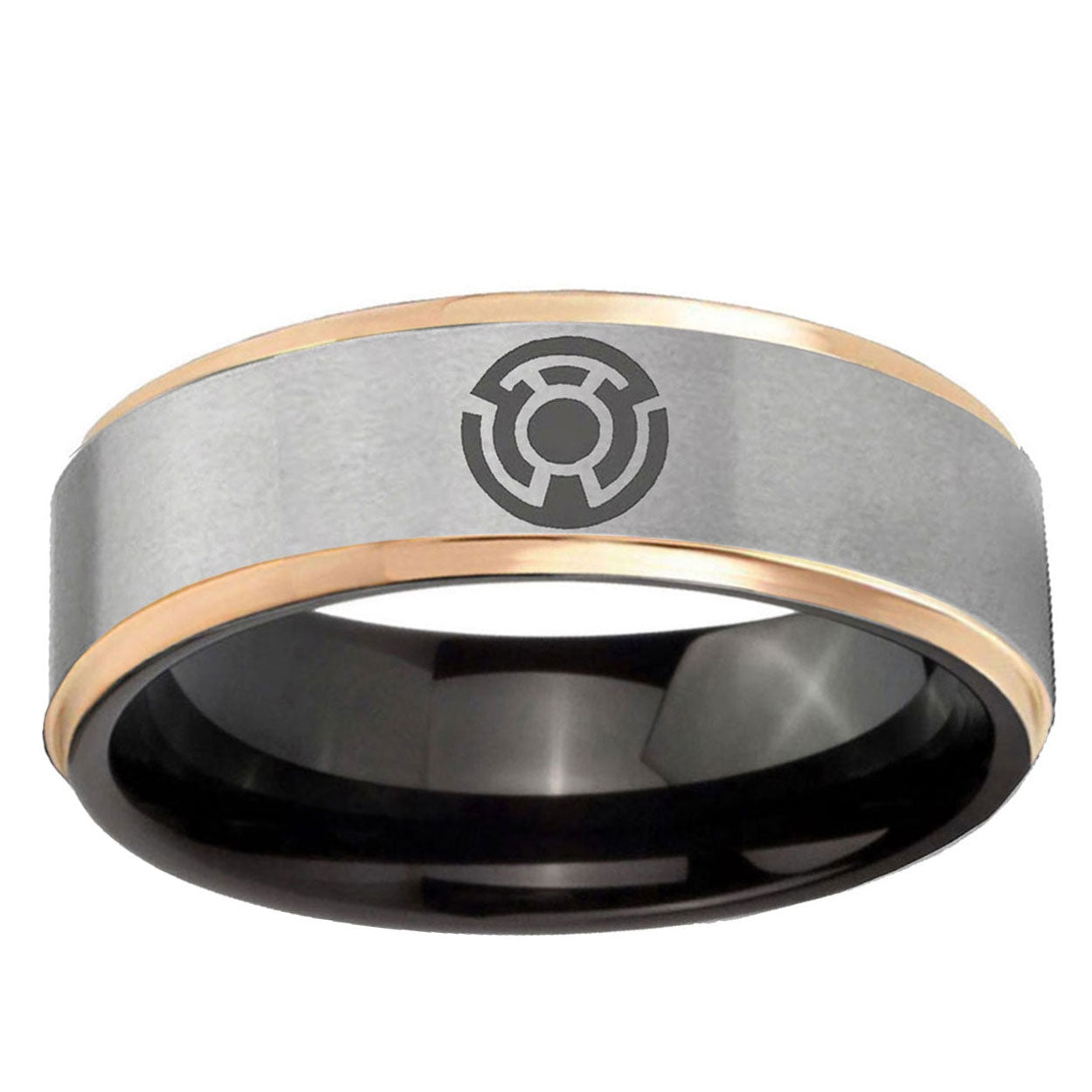 Intruding 8mm Yellow Lantern Rose Gold Step Edge Gray Mens Steel Wedding Bands . Offer in men wedding band in 8mm band width brushed black plated finished from size 7 to 14