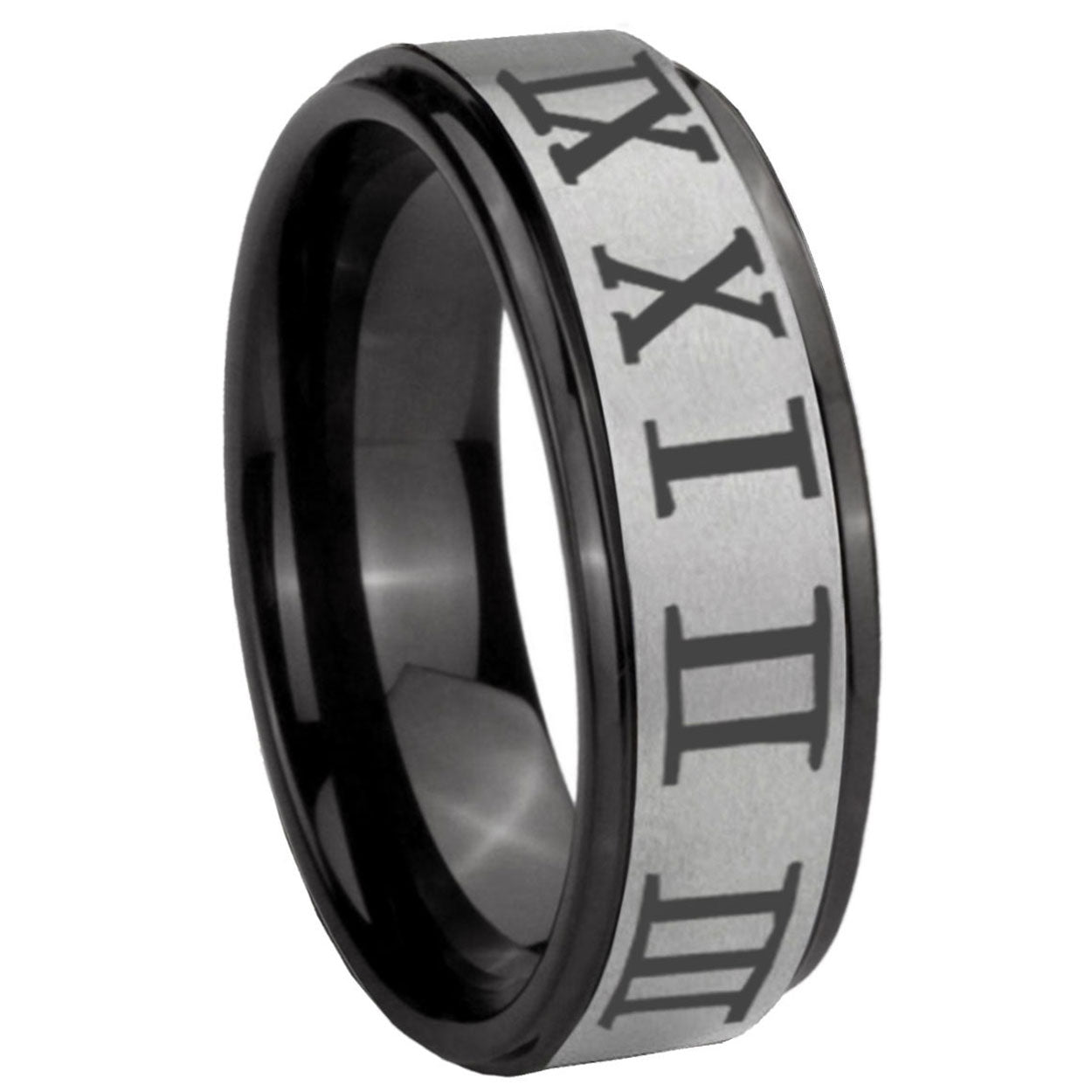 Intruding 6, 8mm Roman Numeral Black Step Edge Gray Tungsten Carbide Custom Ring for Men . Offer in both 6mm and 8mm band width black plated finished from size 7 to 14