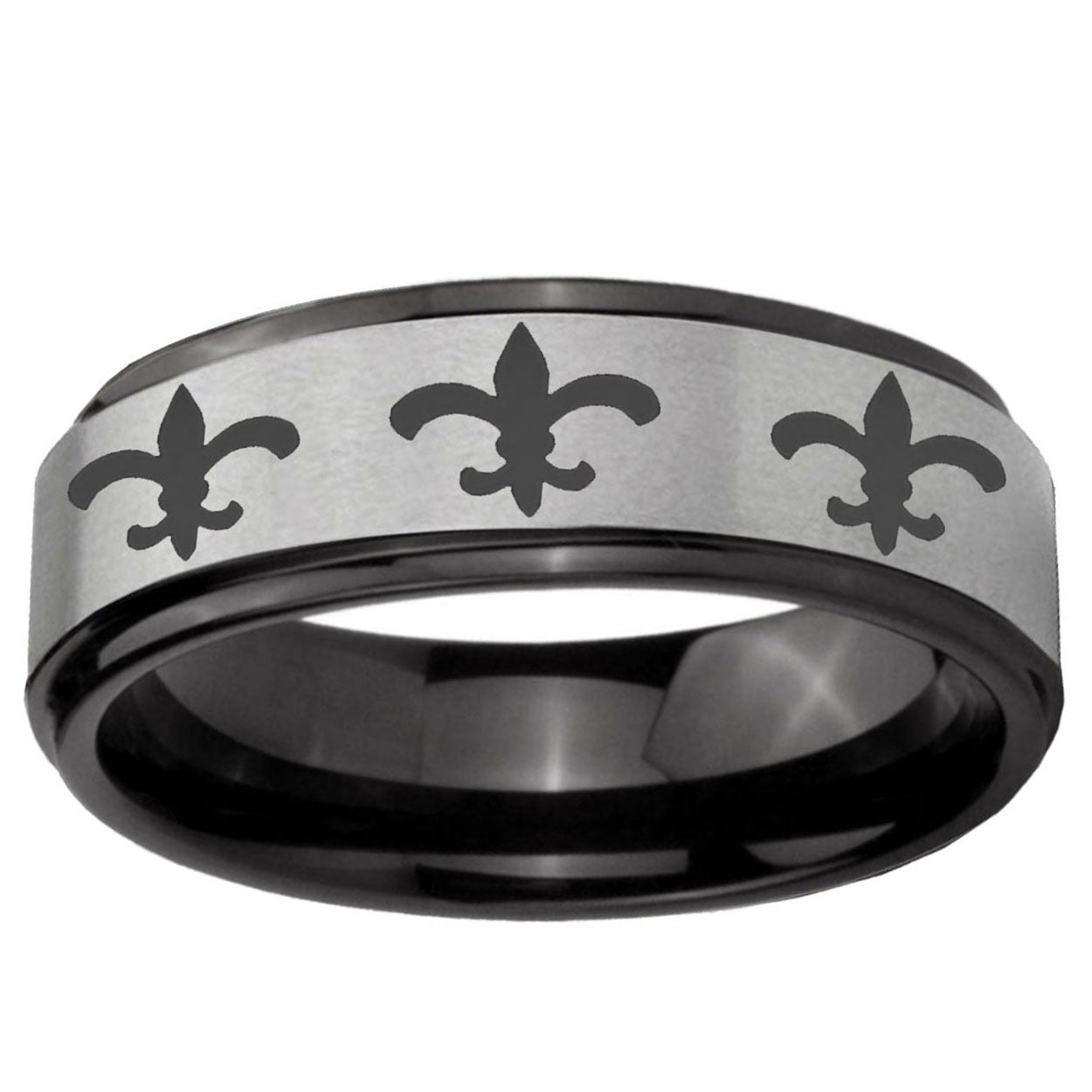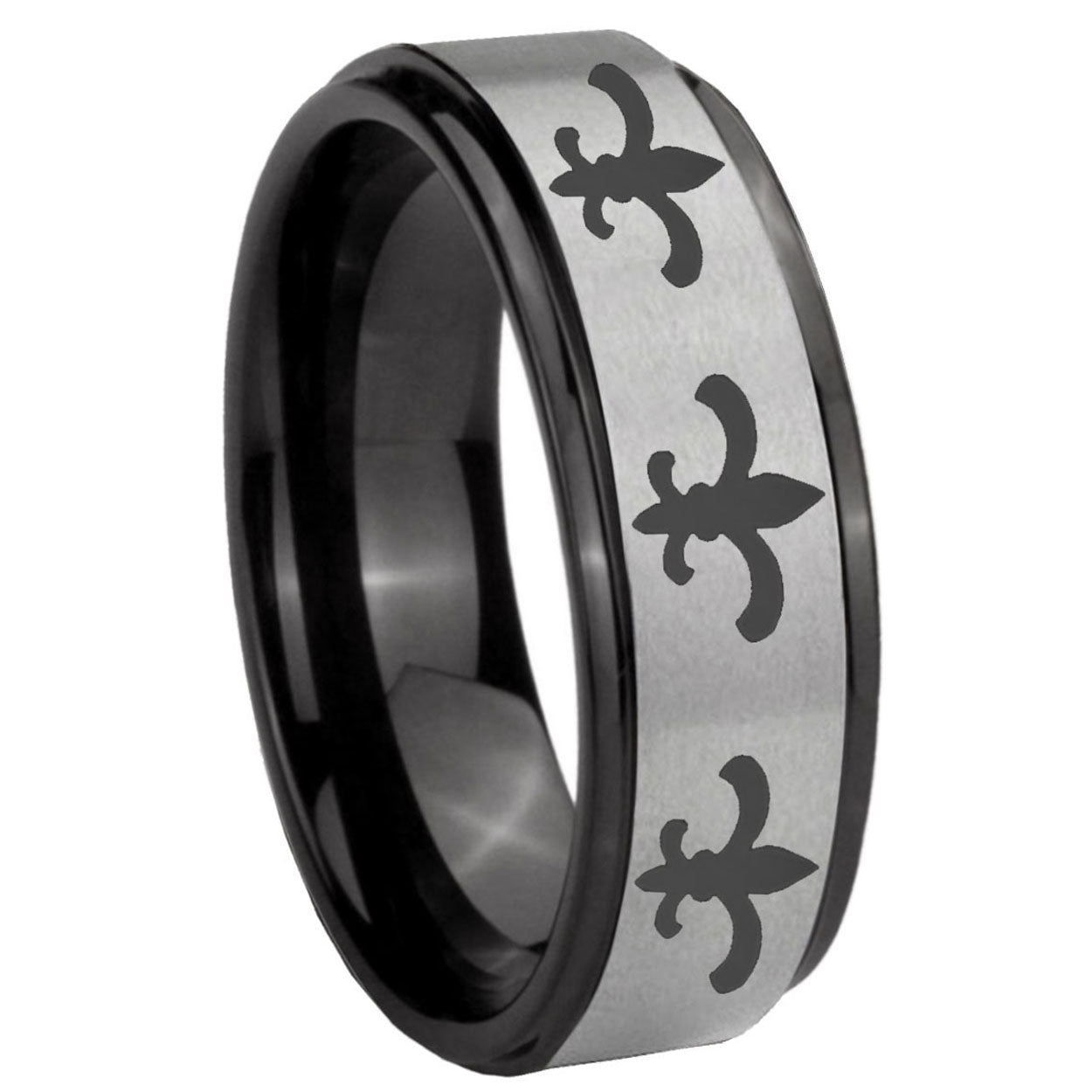 Intruding 6, 8mm Multiple Fleur-De-Lis Black Step Edge Gray Tungsten Mens Ring Personalized . Offer in both 6mm and 8mm band width black plated finished from size 7 to 14