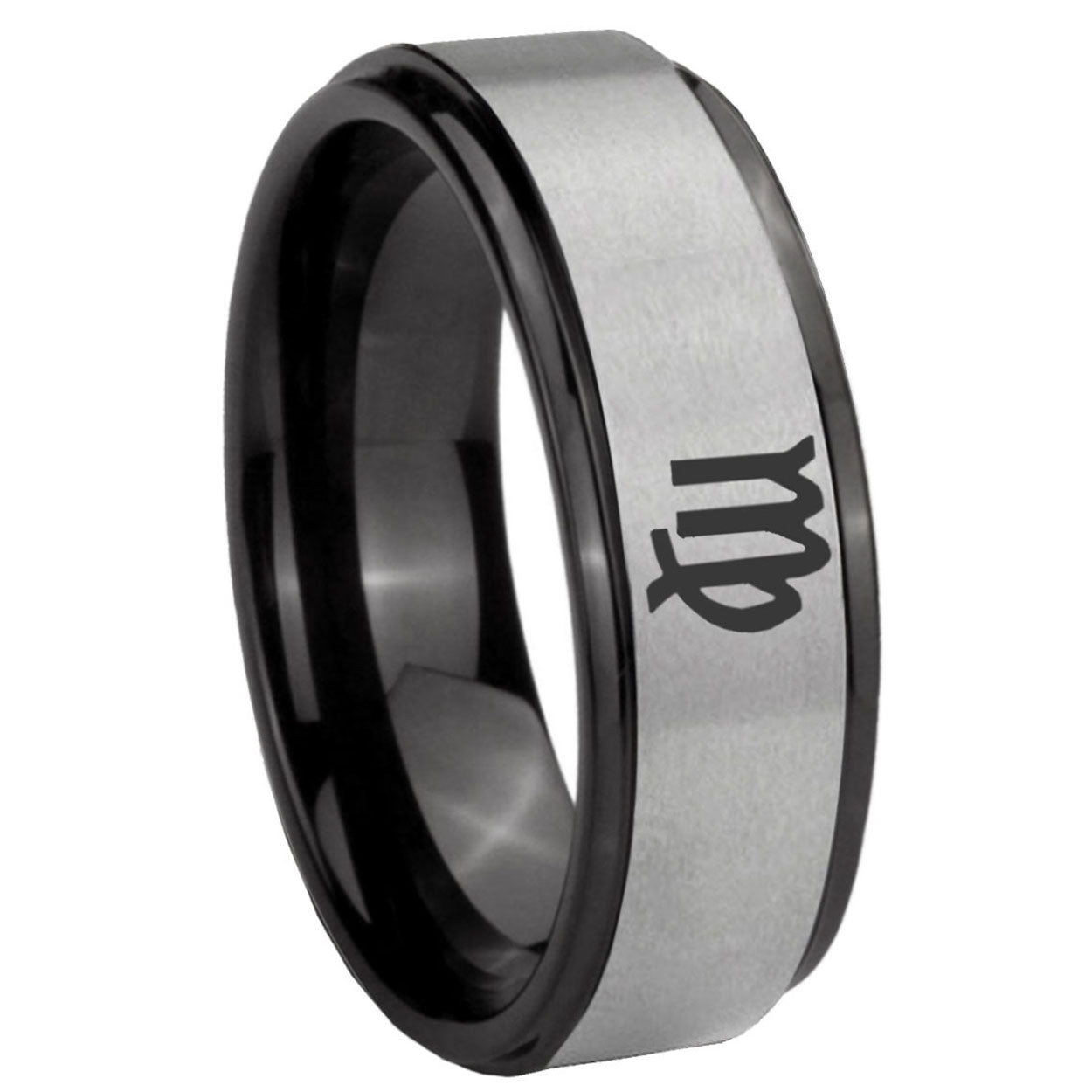 Intruding 6, 8mm Virgo Zodiac Black Step Edge Gray Tungsten Carbide Mens Anniversary Ring . Offer in both 6mm and 8mm band width black plated finished from size 7 to 14
