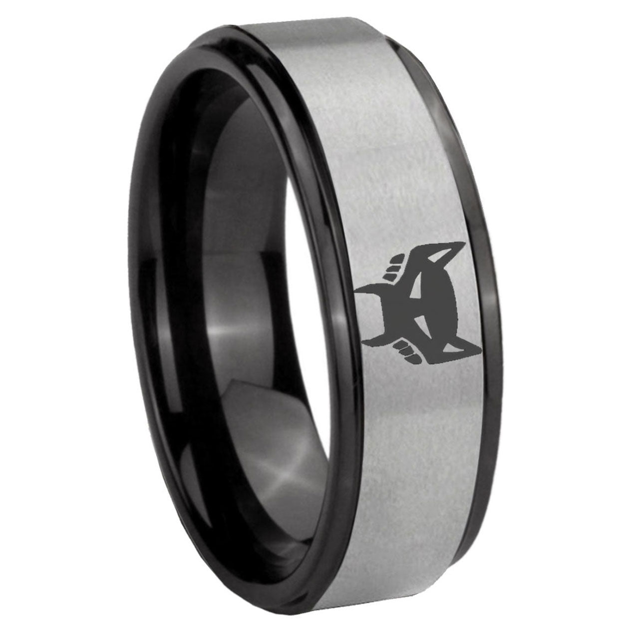 Intruding 6, 8mm Maximal Black Step Edge Gray Tungsten Carbide Mens Engagement Ring . Offer in both 6mm and 8mm band width black plated finished from size 7 to 14