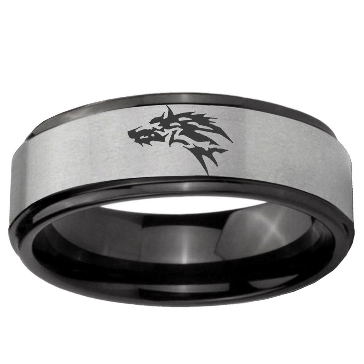 Intruding 6, 8mm Wolf Step Edge Black And Gray Tungsten Men's Ring . Offer in both 6mm and 8mm band width Black And Gray plated finished from size 7 to 14