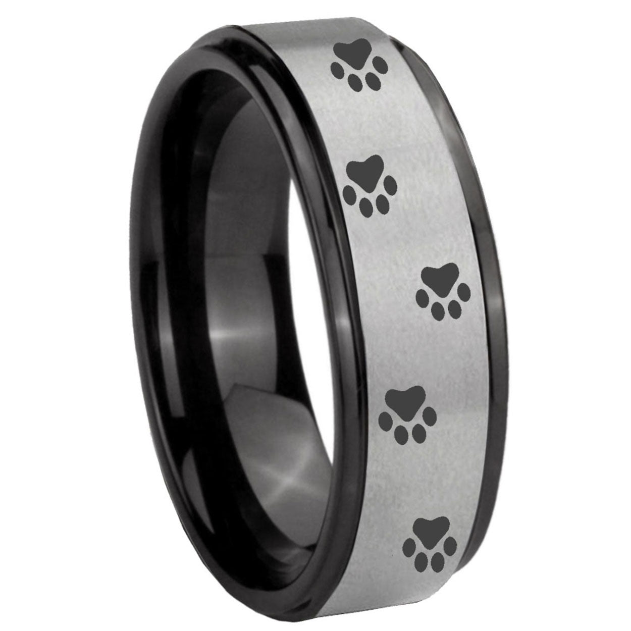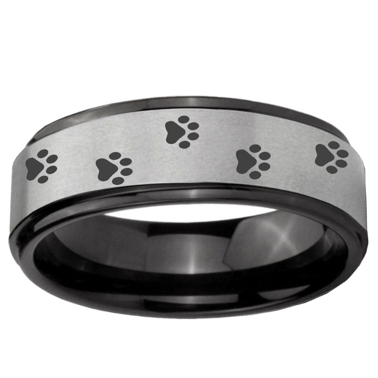 Intruding 6, 8mm Paw Print Black Step Edge Gray Tungsten Carbide Promise Ring . Offer in both 6mm and 8mm band width black plated finished from size 7 to 14