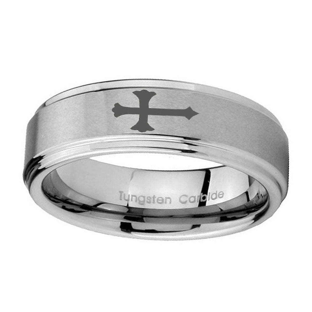 Introuding 5, 8mm Christian Cross Step Edges Brushed Tungsten Carbide Men's Bands Ring . Offer in both 5mm and 8mm band width brushed grey fnished from size 4 to 14