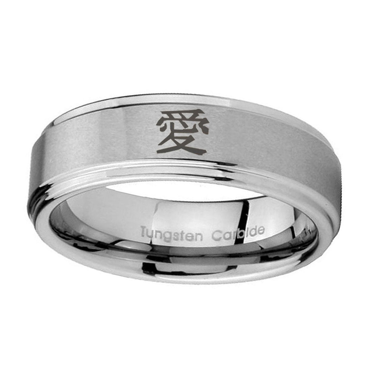Celebrate with the 10mm Kanji Love Step Edges Brushed Tungsten Carbide Wedding Band Ring. This brushed tungsten ring with Kanji Love design and step edges is perfect for weddings.