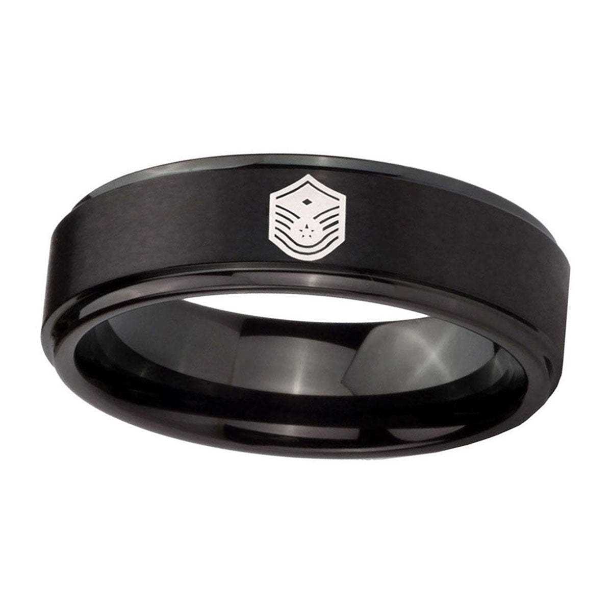 Introuding 5, 8mm Chief Master Sergeant Vector Step Edges Brush Black Tungsten Engagement Ring . Offer in both 5mm and 8mm band width brush black plated fnished from size 4 to 14
