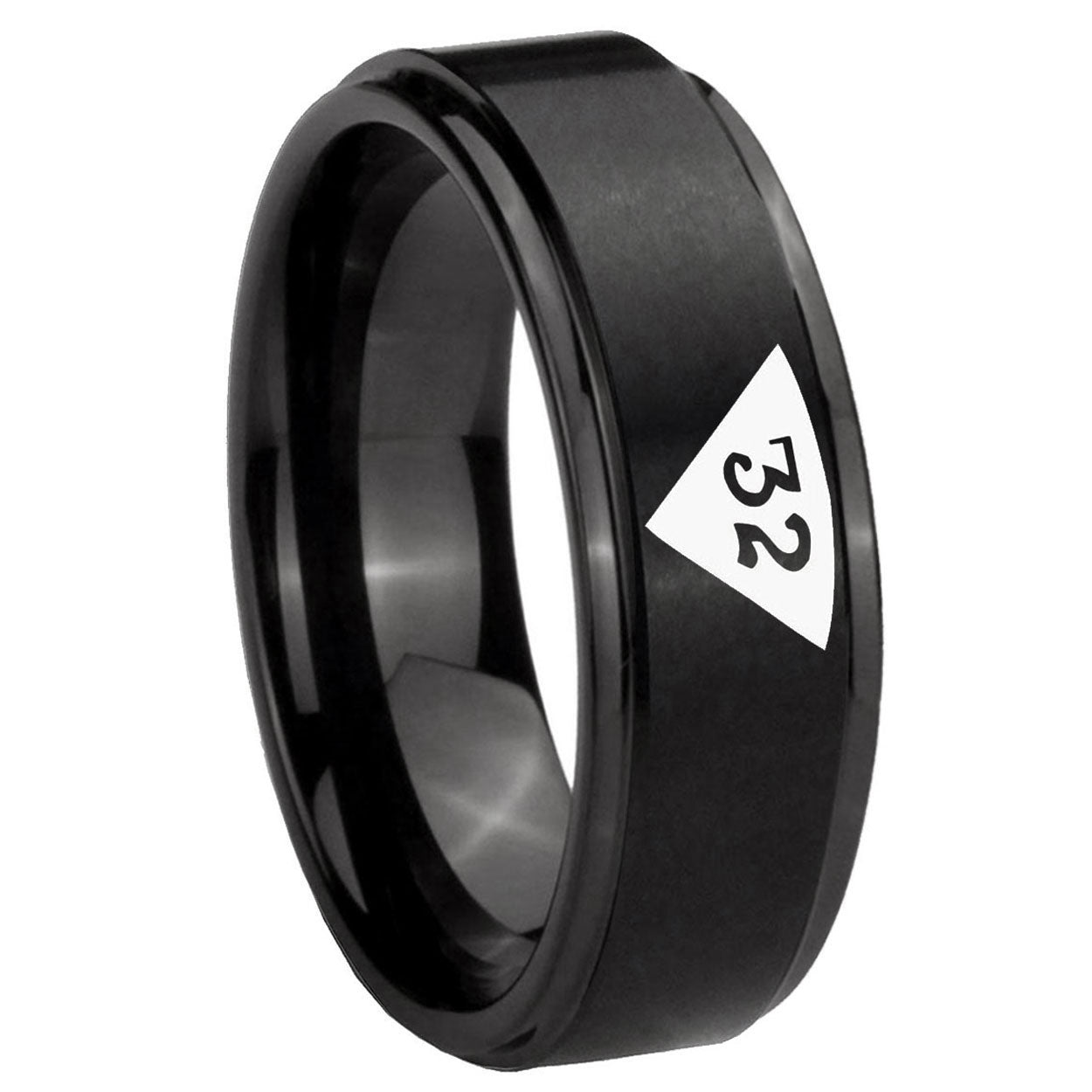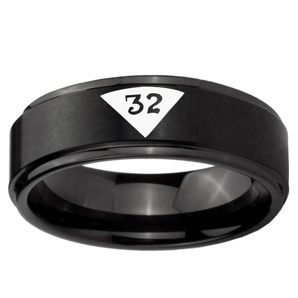 Propose with the 10mm Masonic 32 Triangle Design Freemason Step Edges Brush Black Tungsten Carbide Mens Engagement Band. This brushed black ring with step edges and Masonic design is ideal for engagements.