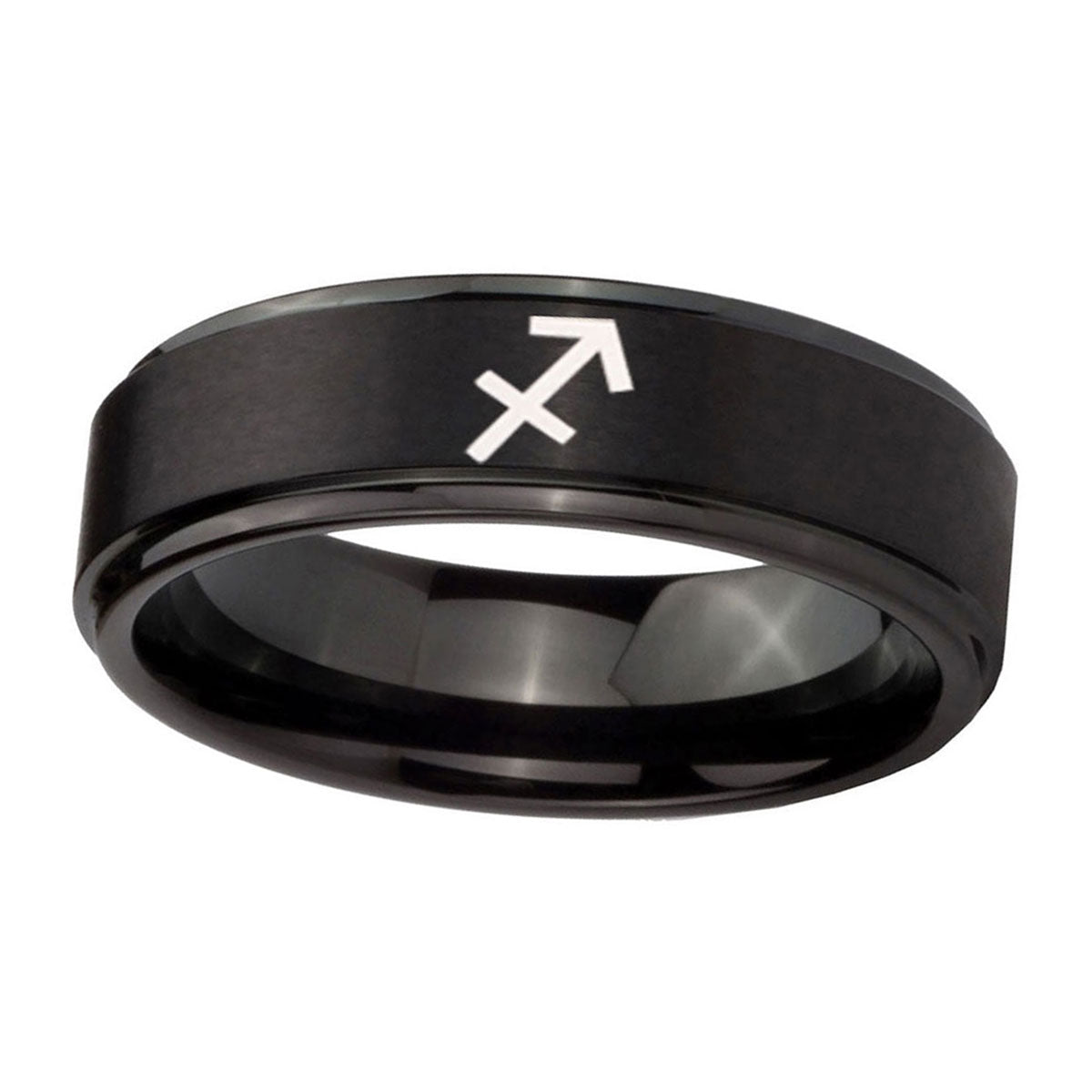 Propose with the 10mm Sagittarius Zodiac Step Edges Brush Black Tungsten Men's Engagement Band. This brushed black ring with step edges and Sagittarius Zodiac design is ideal for engagements.