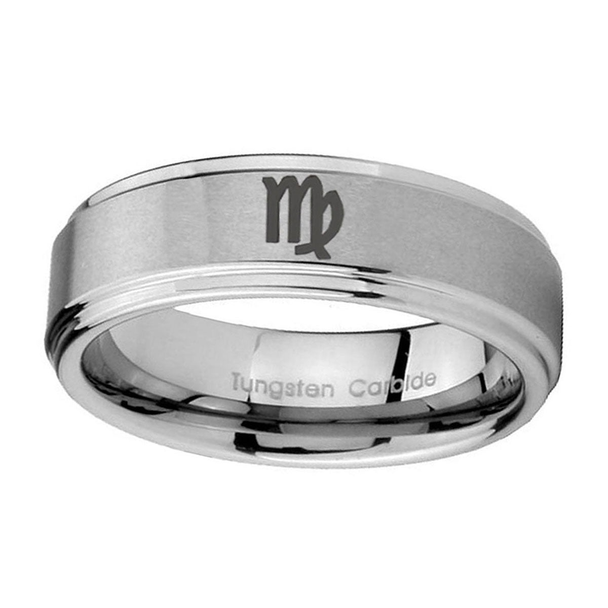 Style the 10mm Virgo Zodiac Step Edges Brushed Tungsten Carbide Men's Bands Ring. This brushed tungsten ring with step edges and Virgo Zodiac design is perfect for men.