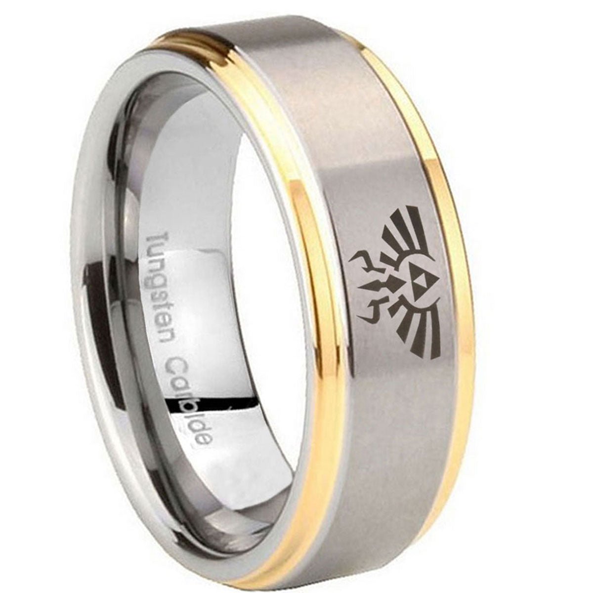 Celebrate with the 10mm Zelda Skyward Sword Step Edges Gold 2 Tone Tungsten Men's Wedding Band. This gold and 2-tone tungsten ring with Zelda Skyward Sword design is perfect for weddings.