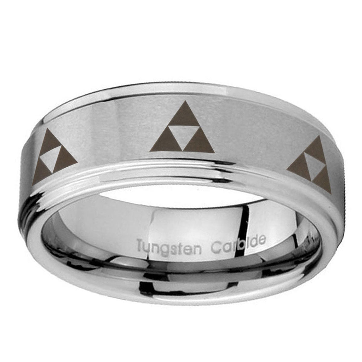 Introuding 5, 8mm Multiple Zelda Triforce Step Edges Brushed Tungsten Wedding Bands Ring . Offer in both 5mm and 8mm band width brushed grey fnished from size 4 to 14