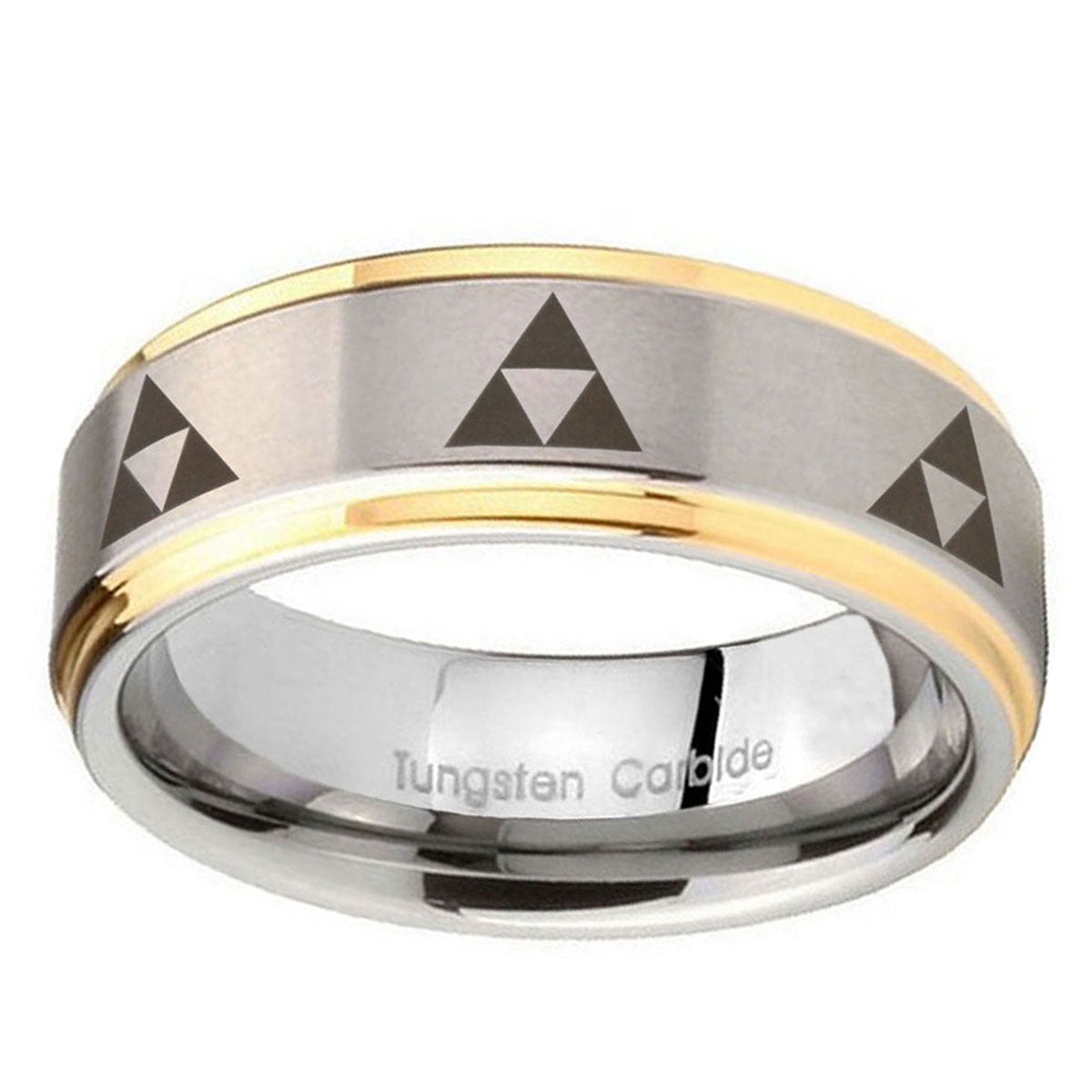 Introuding 5, 8mm Multiple Zelda Triforce Step Edges Gold 2 Tone Tungsten Promise Ring . Offer in both 5mm and 8mm band width grey and gold 2 tone fnished from size 4 to 14