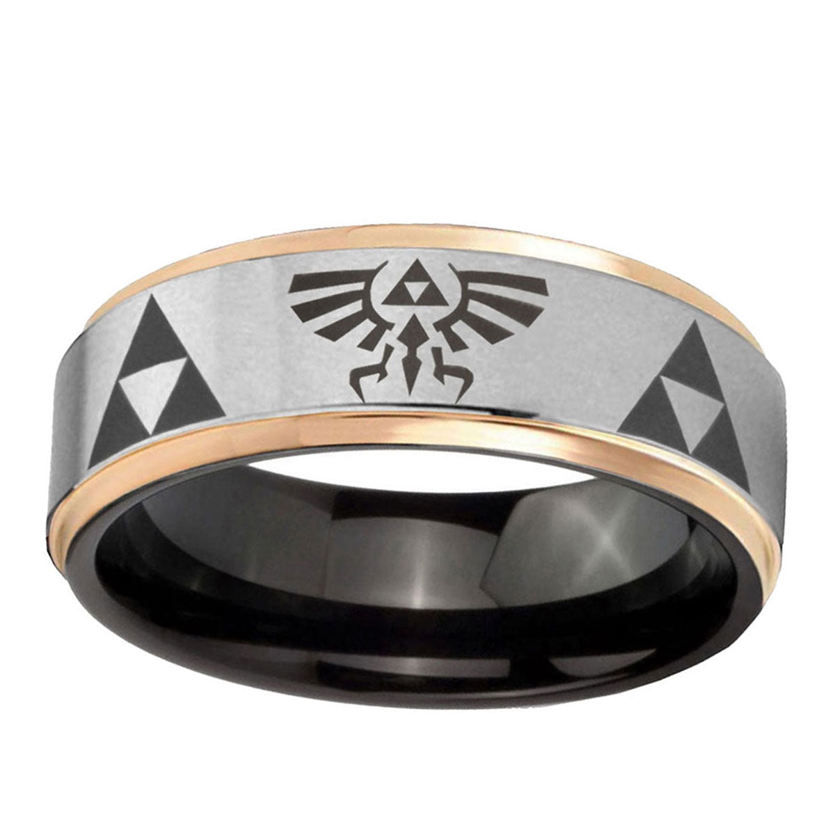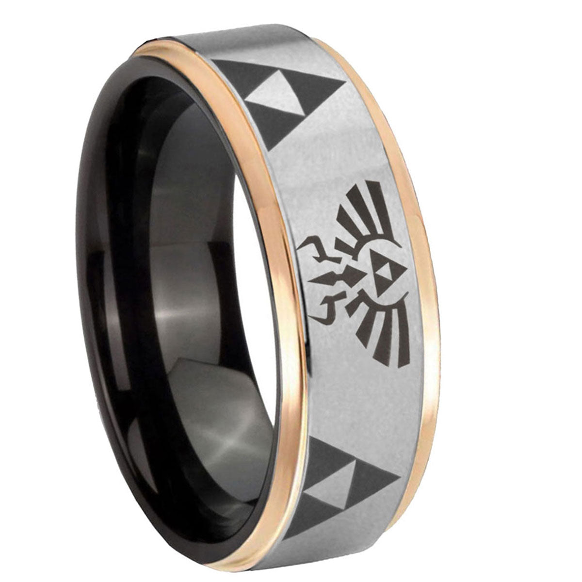 Introuding 8mm Legend Triforce Zelda Gray Rose Gold Step Edges Tungsten Carbide Mens Ring . Offer in 8mm band width rose gold and grey plated finished from size 7 to 14