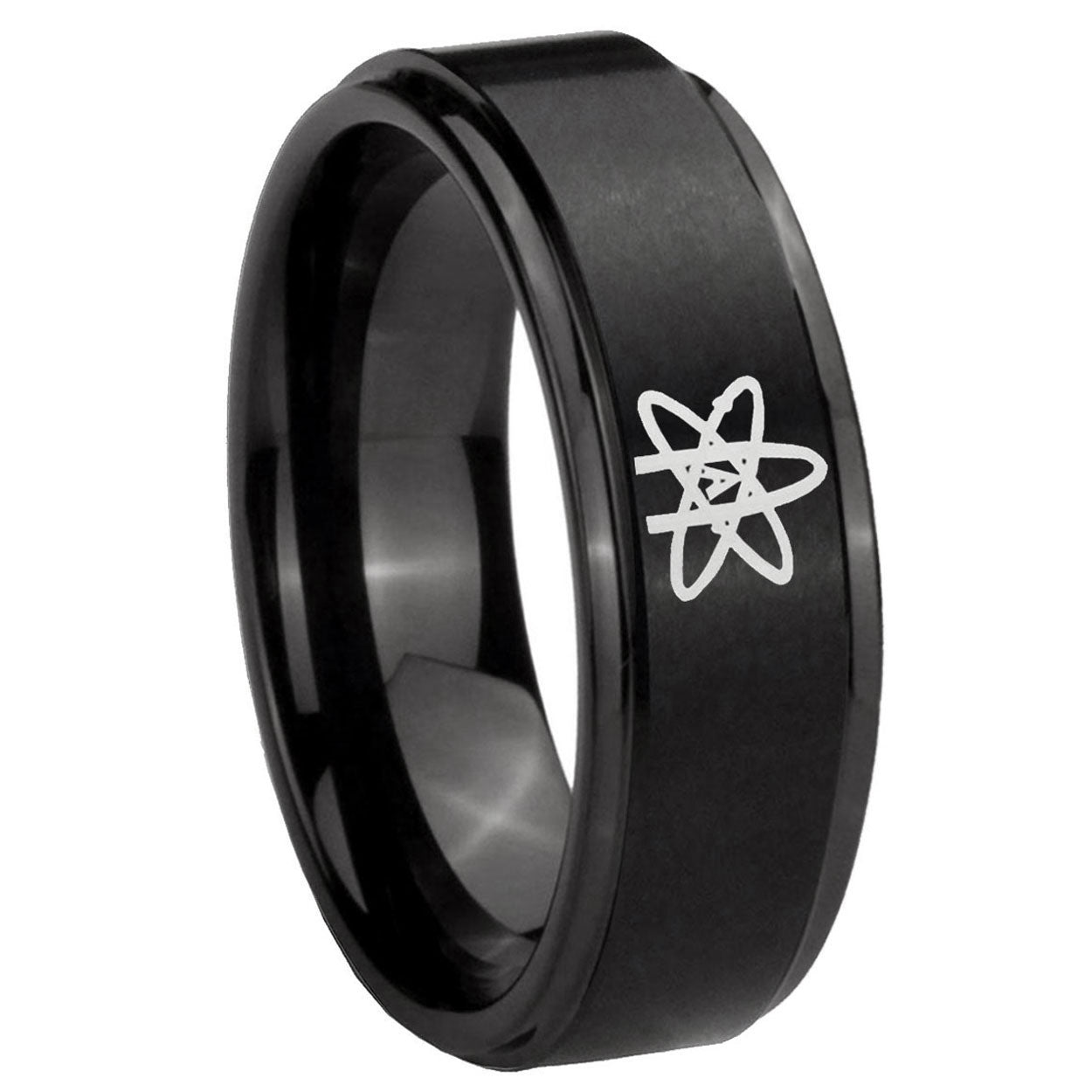 Intruding 5, 8mm American Atheist Step Edges Brush Black Tungsten Carbide Men's Ring . Offer in both 5mm and 8mm band width brush black plated finished from size 4 to 14